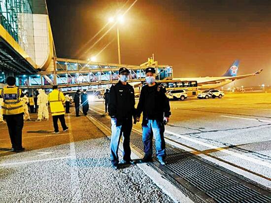 广州特警李日东(右一)和队友值守白云机场,执行入境旅客转运任务 受访者供图 |