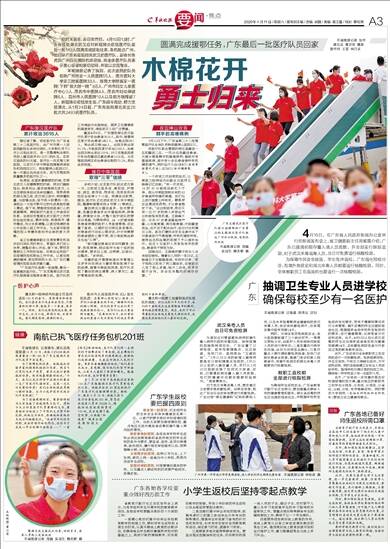 羊城晚报记者 张华 通讯员 粤卫信 魏星 游华玲 王雪 林巧文 战时无畏去,春日安然归。4月10日13时,广东省援助湖北武汉应对新冠肺炎疫情医疗队最后一批183人圆满完成援助任务,乘