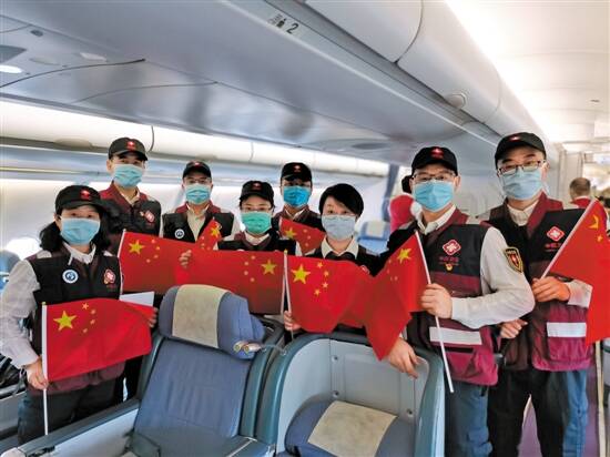 专家组今晨出征,在机舱中合影 专家组供图 |
