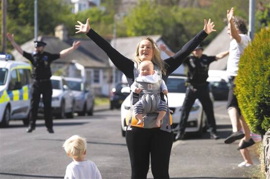 近日,英国为了防控疫情而留在家里的社区居民与警察一起跳舞,传递积极健康的讯息 新华社发 |