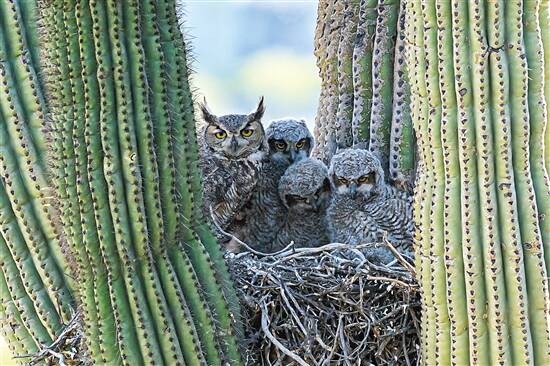 这种灰角猫头鹰本身是种凶狠的猛禽,但也是尽职尽责的父母。当雌性猫头鹰产卵后,会一直待在巢里孵化,这时便会由雄性猫头鹰负责外出寻找食物、喂养伴侣。到幼鸟破壳而出,这位父亲还要肩负起喂养幼鸟的工作。摄影师拍到的画面中,只有一只成年猫头鹰和三只雏鸟,一脸呆萌地看着镜头。可能另一只成年猫头鹰已出外觅食。如果父母都出外捕食,幼鸟难免会遭遇其他猛兽的袭击,因此筑巢的安全性相当重要。 这一家子选择用树枝在仙人掌上筑巢,显然是非常明智之举——一来可以防御外敌,二来仙人掌储水量充足,依靠它们生活,也可以躲避沙漠的炎热天气。 它们选择的这种巨柱仙人掌其实是世界上最高的仙人掌品种之一,不仅高度惊人,储水量也惊人。据说一株巨柱仙人掌的根系能吸收大约一吨水,若在沙漠找不到水源,劈开巨柱仙人掌,也能取水解渴。因此巨柱仙人掌对沙漠来说,有非常重要的生态作用,它周围常常能形成一个自然生态圈,不仅有猫头鹰这样的猛禽,还包括地下的动物、昆虫等。 (CC/文 视觉中国/图)