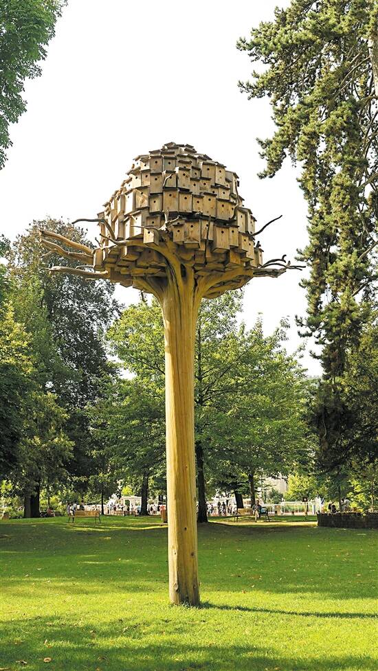 鲍勃在树状支柱上,架设了成排的小房屋,看上去颇有些像那些城市特色鲜明的密集式公寓楼。它们大小各异,但错落有致,想必鸟儿们也不会介意邻居们是否熬夜,或是它们早上出门是否太吵、喂养幼鸟时是否太闹。能在城市一隅有如此精致的小窝,也是一种福气吧。 (BOBO/文)
