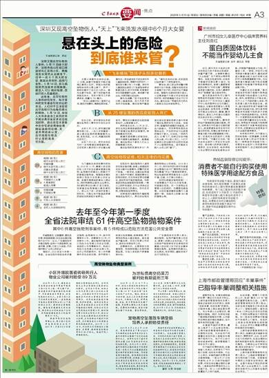 羊城晚报记者 郭起 深圳又现高空坠物伤人事件。5月11日晚9时许,深圳市南山区蛇口街道望海汇景苑小区,两瓶洗发水突然从高楼落下,砸中一名6个月大的女婴,致其头骨骨折,后脑勺变形。5月14日,婴儿病情突然加重并出现抽搐,被送入ICU病房抢救,目前已转入普通病房。 近年来,高空坠物伤人事件时有发生,每次事件的发生都会引发舆论的关注。人们对于立法监管高空抛物行为也抱有很大的期待。5月14日,全国人大常委会法工委回应关于民法典草案征求意见情况时称,群众意见主要集中在住宅建设用地使用期届满如何续期、夫妻共同债务认定、高空抛物坠物责任认定的完善等方面。 A “飞来横祸”致孩子头部多处骨折 女婴父亲高先生告诉记者,11日晚,其妻子抱着孩子路过望海汇景苑小区时,两瓶白色的瓶装物体突然从楼上掉下,其中一瓶刚好砸中了自己女儿的头。高先生妻子发现,掉下来的竟然是两瓶洗发水,洗发水瓶内几乎装满液体,容量为750毫升。 “我女儿被砸中后一度哭不出来,随后开始颤抖,嘴唇逐渐发紫。”高先生一家迅速将孩子送往深圳市儿童医院抢救。据高先生的估计,一瓶洗发水最少有1斤半重。深圳市儿童医院出具的CT检查报告单诊断意见显示:孩子双顶骨、枕骨骨折伴双顶部硬膜外血肿,蛛网膜下腔出血,双侧顶部头皮血肿。 高先生透露:“孩子经抢救后已转入普通病房,但今天孩子却突然开始抽搐,情况变得严重起来。”高先生告诉记者,目前医院已给家属下了病危通知书。 事发后,蛇口派出所民警对楼房进行住户排查,但暂未发现洗发水是哪户住户的,目前仍处于调查阶段。据高先生提供的图片显示,小区楼房窗户大部分并没有安装防护网,有的玻璃窗户还处于打开状态。高先生说:“希望洗发水的主人能够主动出来承担责任。” B 从25楼坠落的西瓜皮能致人死亡 在此之前,深圳曾发生多起高空坠物伤人事件并引发社会关注。 去年6月13日,深圳福田御景华城小区,一名5岁男童被一扇从高空坠落的玻璃窗砸伤头部,紧急送医。16日,男童因抢救无效死亡。 去年7月6日,深圳龙华区弓村一住宅楼高空掉落塑料瓶,正在和家人散步的6岁女童头部受伤,事发后女童被送往医院接受治疗,头部被缝4针。 同样是在去年,11月26日,深圳龙岗区南湾街道荔枝花园一男子被高空坠落的空瓶砸伤,导致眼睛受伤失明。 随着我国城镇化进程加快,城市中高楼也越建越多,越建越高。高空坠物这个悬在人们头上的隐患随之而来。 高空坠物的危害有多大?央视记者此前曾到西南交通大学做了高空坠落的杀伤力实验。实验证明:碰撞物的接触时间越短,冲击力就越大,而如果物体是自由落体运动,产生的冲击力比滚落的情况下更大。比如说,一块西瓜皮从25楼飞下,如果正好击中路人的头部,可以致人死亡。人们不经意间从阳台随手扔出的垃圾或不小心碰落的物品,很可能成为路人头顶上的“屠刀”。 C 高空抛物取证难,相关法律仍待完善 为了遏制此类恶性事件的发生,2019年11月,最高人民法院印发《关于依法妥善审理高空抛物、坠物案件的意见》,明确对于故意高空抛物者,根据具体情形按照以危险方法危害公共安全罪,故意伤害罪或故意杀人罪论处,同时明确物业服务企业责任。而《侵权责任法》第87条又规定,如果高空坠物案难以确定侵权人,那么为了进一步保护受害人的权利,只能让有可能造成损害的居民共同承担补偿责任。 在现实中,高空抛物伤人通常存在取证难问题。就像上面提到的洗发水砸中女婴事件,民警仍在逐户排查。一般来说,当高空坠物造成人身财产伤害时,根据民事诉讼的相关规定,可采用举证责任倒置法,起诉所有可能的抛物者。也就是起诉物品被抛落的那栋楼、一楼以上的所有居民,对方必须举出证据来证明自己的清白,如无法证明,则要承担连带责任。 如果是因为建筑物外墙脱落等造成坠物伤人,责任则由相关建筑物物业公司承担。2019年5月1日,深圳发布的《深圳市房屋安全管理办法》对“建筑物主体结构及幕墙”作出了管理规范要求,物业检查的职责范围包含小区的外墙、过道、大厅等公共部分。 如何杜绝高空抛物现象?一方面要靠住户充分认识其危害,并提高自觉性;另一方面物业在管理小区的同时,也靠要加强监管,比如在高层建筑紧靠行人通道的一侧,加装向上拍摄360度的摄像头等。