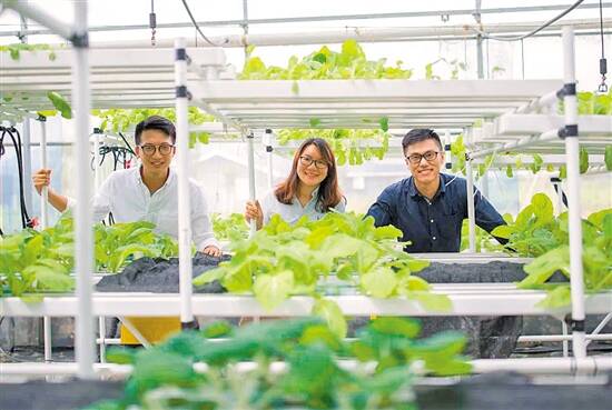 梁立锋、谭慧敏、罗伟特(从左到右)的“鱼菜共生梦”在江门落地生根(江门市现代农业综合示范基地供图) |