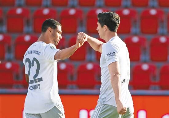德甲第26轮今晨上演焦点战,“领头羊”拜仁慕尼黑客场以2比0完胜“升班马”柏林联,莱万多夫斯基和帕瓦尔各入一球。拜仁积58分继续领跑,多特蒙德以4分之差排名次席,门兴(52分)和莱比锡(51分)分列第三和第四。 莱万连续5赛季进40球 “升班马”柏林联在本赛季首次来到顶级联赛,他们成为德甲历史上的第56支球队。拜仁王牌射手莱万多夫斯基原本将缺席这场比赛,他在2月27日客场3比0大胜切尔西的欧冠1/8决赛首回合膝盖受伤,要休战4周。但疫情让联赛停摆的同时也让莱万获得了养伤的时间。 在拜仁的阵容中,莱万出任首发中锋,身后三名攻击型中场是穆勒、格雷茨卡、格纳布里。拜仁阵容很奢华,法国边锋科曼和克罗地亚边锋佩里希奇坐上替补席,巴西球星库蒂尼奥因伤没有进入比赛名单。 第17分钟,穆勒攻入一球,但经过VAR审核后被判越位在先,进球无效。拜仁第一个进球还是要由首席射手攻入,格雷茨卡第40分钟在禁区内被踢倒,莱万操刀罚进点球。 莱万进球后,遵守保持社交距离的规定,只和队友们击肘庆祝。莱万本赛季代表拜仁出场34次,连续5个赛季在俱乐部正式比赛进球达到40球,他在德甲射手榜以27球领跑,在欧冠射手榜以10球与哈兰德并列第一,除此之外,他还打进了3个德国杯进球。 穆勒再显“二娃”本色 德甲重启之后,很多球队的主教练在场边指挥时没有戴口罩,例如多特蒙德主帅法夫尔和沙尔克主帅瓦格纳。柏林联主帅菲舍尔此前违反规定擅自离队,他必须接受两次新冠检测并全部呈阴性之后才能回归球队,目前还处于居家隔离状态,故本场比赛柏林联只能由助教霍夫曼在场边指挥。 相比之下,拜仁主帅弗里克在防护方面做得十分到位,他在指挥比赛时始终戴着口罩,口罩上有醒目的拜仁队徽。 拜仁阵中人才济济,弗里克此役的换人却非常谨慎,他没有按照新规则换满5人,而是只进行了三次换人。第71分钟,弗里克用科曼换下格雷茨卡。第85分钟,佩里希奇替补出场换下格纳布里。第89分钟,穆勒被屈桑斯换下。 也许是为了给这场稍显平淡的比赛增色,穆勒离场时拒绝了弗里克的击肘邀请,而是抬起左腿虚踹了主教练一脚,这样的“幼稚”举动真的是相当有穆勒特色。 羊城晚报记者 刘毅