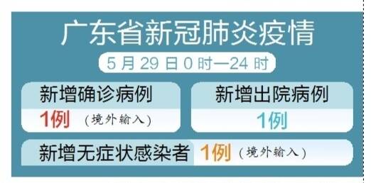 29日0-24时,广东省新增境外输入确诊病例1例,广州报告,来自孟加拉国,在入境口岸发现,入境后即被隔离观察。新增出院1例。