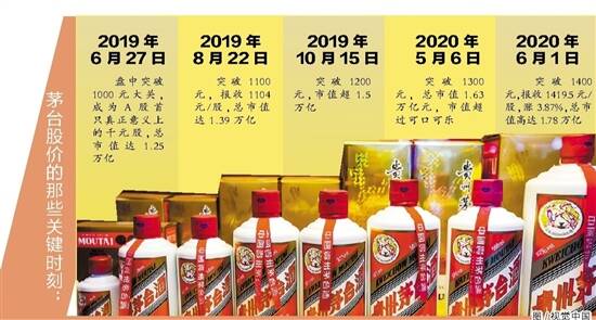 羊城晚报记者 程行欢 实习生 陈恭梓 6月1日,茅台股价历史性地攀登上了1400元的高峰,其总市值也创下1.78万亿的新高,直逼“宇宙第一大行”工商银行。2日,茅台股价最高上扬了5.15%,虽然最后以微跌0.62%收盘,但股价已经稳站在了1410.71元。据羊城晚报记者统计,茅台股价从1000元上扬到1400元,每上涨百元的时间节点分别为2019年6月27日、8月22日、10月15日,以及2020年5月6日、6月1日,总市值也从1.25万亿元增长到1.39万亿、1.5万亿、1.63万亿以及目前的1.78万亿。 羊城晚报记者梳理发现,茅台股价在去年6月22日盘中首次突破1000元大关,成为A股首只真正意义上的千元股,总市值达到1.25万亿元。 关于“茅台股价破千后会怎么走”,曾经有过相对激烈的争论,争论无外乎其估值合理不合理。但机构投资者与券商则一直对这只股票情有独钟,并且不断给出更高的估值。记者注意到,就在茅台突破1400元之前,多家券商对贵州茅台给出最新评级,均为“买入”或“强烈推荐”,且给出的目标价均在1500元之上。其中,招商证券看高至1519元,为当前券商给出的目标价中最高;广发证券看高至1506元;方正证券看高至1500元。 除了紧张的供需关系和强势品牌,茅台的股价还有着业绩的强力支撑。2019年是茅台集团自2016年白酒行业复苏以来达到巅峰的一年。茅台集团的股价突破了千元,公司估值也破了万亿。2020年开年以来,受到疫情影响,茅台集团第一季度的营收和利润环比有一定幅度的下降,但是同比去年第一季度仍然有一定量的增长。 根据其第一季报显示,当季营业总收入达到252.98亿,同比增加12.54%,净利润达到130.94亿,同比增幅16.69%。 除了股价的坚挺表现,一年一度的茅台股东大会即将在6月10日召开。去年,由于股东能在现场按1499元购买原价茅台1箱,吸引了2000多股东前往现场参会,创下了历年纪录。今年,考虑到疫情防控仍有风险,茅台公司预计将缩减总体大会的规模。