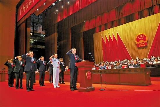 新当选的广州市第十五届人大常委会主任石奇珠等10人进行宪法宣誓 羊城晚报记者 宋金峪 摄 |