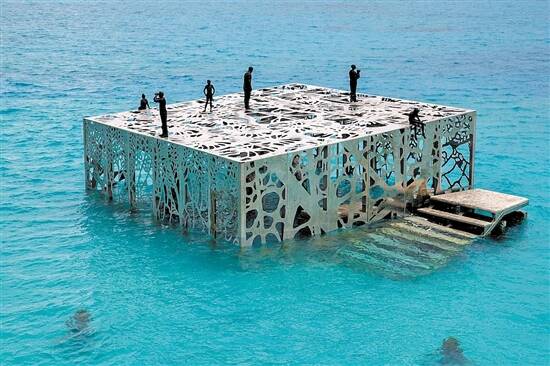 文/建平 图/视觉中国 2010年建成的墨西哥坎昆水下博物馆,以在海底投放了400余座真人大小的名家雕塑而闻名于世界,要参观这家博物馆就必须全副武装地穿着潜水服、背着氧气罐前往。 最近,在马尔代夫斯茹芬富士岛又有一家水下艺术博物馆声名鹊起,它就是由当地费尔蒙酒店联手英国知名水下自然主义者和雕塑家詹森·德卡莱斯·泰勒打造的全球首座半潜式艺术馆——The Sculpture Coralarium。 随潮涨潮落而显隐 这是马尔代夫第一个也是唯一一个以水下艺术装置形式呈现的珊瑚再生项目。它也是世界上首座半潜式艺术博物馆。 它以一个半浸在水中的立方体形式呈现,目前拥有的艺术品基本上维持着三个维度的存在:一是放置在立方体结构顶部的屋顶雕塑;二是放置在不同高度的柱脚上的水下艺术品和雕塑;三是以半潜形式存在的雕塑立方体单元,将陆地和海洋之间相连接,同时水下与水面都可以欣赏。 第三部分的一个巨大镂空立方体,是由无毒的PH值为中性的海洋性不锈钢制成,最高处距离海底6米。设置这个高度,是考虑到当地潮汐的起落。涨潮时,整个艺术馆将全部淹没在水平面下;退潮时,艺术馆又可显露一半在水面上。 人们可以通过潜水进入此馆内近距离观赏雕塑艺术,退潮时,也可以通过水下楼梯上到干燥的观察平台上去参观。 环保与审美两不误 这是一座有环保意义的建筑,因为这些雕塑艺术品其实还起到珊瑚礁的作用,有利于珊瑚的生长。所以它不仅是一间水下艺术博物馆,也是珊瑚再生艺术馆,不久的将来,生长的珊瑚将和这些人体雕塑相结合,形成“会生长变化的雕塑”。 参与设计的艺术家詹森·德卡莱斯·泰勒毕业于伦敦艺术学院雕塑专业,他曾做过全职的潜水教练兼水下自然学家,2006年开始水下雕塑创作。他早已凭借具有环境意识的水下雕塑而扬名世界。他的大型雕塑作品已分布到世界上好几处近海领域被长期摆放。泰勒早年于西印度群岛格林纳达海岸建立的第一座水下雕塑公园,现已成为国家地理杂志列为排名前25位的世界奇观之一。墨西哥著名的水下艺术博物馆 MUSA也收有他的作品。他还在澳大利亚建起海底美术馆项目“MOUA”,不久也将对外开放展出。 泰勒认为,海洋环境越来越令人担忧,脆弱的珊瑚也可能因为人类破坏性的活动而彻底消失。他希望用这种方式唤醒人们的环保意识。这些雕塑大多是在陆地上完成,主题内容也多以人类社会日常的状态为主,最后再沉入海底摆放。一些人物表情丰富,处于海底环境中的模样或许会令人不安,但也正好象征着创作者对未来的忧虑。