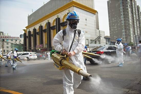 16日,北京蓝天救援队队员在岳各庄批发市场开展消杀作业 新华社发 |