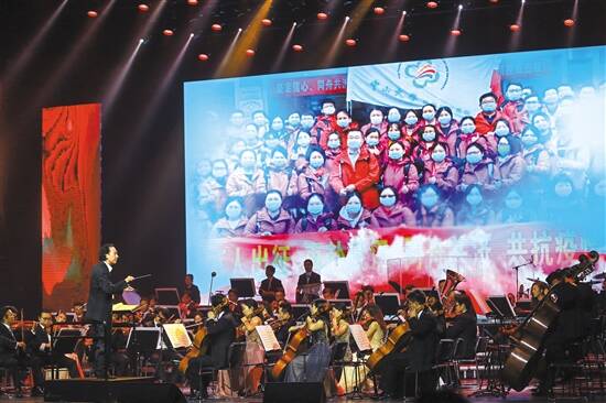 羊城晚报讯 记者黄宙辉、通讯员卢权开报道:19日晚,“为逆行者而歌”——大型流行交响诗画《我爱你中国》在广州友谊剧院上演。本场演出特别邀请了十多家医院的医护人员、公安干警等免费观看。 据主办方介绍,面对新冠肺炎疫情,珠影乐团以最快速度投入创作,在原有基础上进行创作、改编,用了一个月就完成了新版的大型流行交响诗画《我爱你中国》的修改。新版大型流行交响诗画《我爱你中国》,以诗朗诵、管弦乐、流行音乐、民族音乐为主体;以合唱、重唱、独唱等形式,通过与电影画面及舞美视频相结合,以史诗的形式,表达对抗击疫情的医务人员及所有一线工作者们最诚挚的敬意。