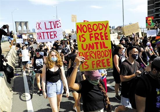 6月19日是美国的“六月节”,又称自由日或解放日,被认为是标志美国奴隶制终结的日子。美国各地民众当日举行“六月节”集会游行,抗议警察暴力执法和种族歧视等问题。图为游行队伍经过美国纽约布鲁克林大桥。 新华社发