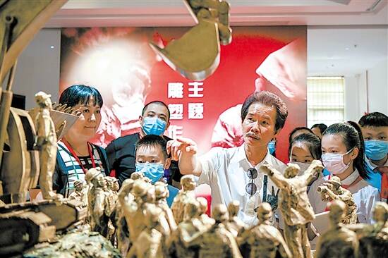 广州雕塑院院长许鸿飞为参观展览的小学生们讲解作品《火神山建设者》 本栏摄影/羊城晚报记者 梁喻 |