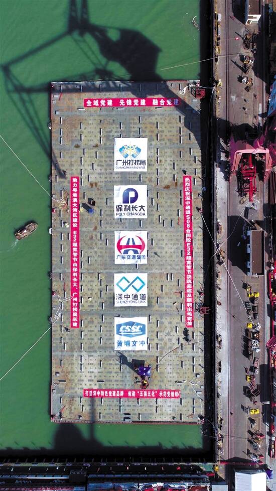 文/图 羊城晚报记者 王丹阳 通讯员 粤交集宣 岳路建 25日下午1时,广州南沙龙穴岛,烈日下的体感温度超过40℃。伴随着建设者的汗水与欢呼声,粤港澳大湾区超级工程——深中通道最宽钢壳沉管E32管节浇筑完成并顺利出坞,刷新了世界上超宽管节在受限水域的出坞纪录,比预计工期提前了一个多月。 智能制造“最宽”隧道的“最宽”管节 深中通道是集“桥、岛、隧、水下互通”于一体的超级跨海通道。沉管隧道长约6.8公里,是世界首例双向八车道钢壳混凝土沉管隧道。沉管隧道共由32节管节组成,国内没有可参考、借鉴的技术指标。 其中,作为世界最宽最长钢壳沉管隧道、深中通道中最宽的一个管节,S08标E32管节将沉放在深中通道的深圳侧,与东人工岛岛头堰筑段对接。 数据显示,E32管节长123.8米,宽由53.6米逐渐变宽至55.46米,高10.6米,具有“超宽、变宽”技术特点,浇筑方量约25000立方米。浇筑完成后的钢壳混凝土管节重约6.8万吨,比今年6月沉放在西人工岛的E1管节还要重8000吨。 深中通道S08标由保利长大工程有限公司、广州打捞局组成联合体共同负责。深中通道S08标项目党支部书记许益光介绍,除E32超宽管节外,S08标段内还有9节“巨无霸”沉管。 如何形象形容E32超宽变宽管节?深中通道S08标保利长大项目经理吴旭东打了个形象比喻:E32管节采用了“三明治”的复合结构——矩形双层钢壳+1.5米厚的高流动自密实混凝土。同时,E32管节重达68000吨,意味着比6万吨排水量的辽宁舰还重。 这样一个独一无二的钢壳“巨无霸三明治”,也凝聚着近年来建设者自主研发和智能制造的先进成果。 吴旭东介绍,仅针对超宽管节用的自密实混凝土,就成立了技术科研专项小组,耗时2年研制而成,混凝土质量寿命可达到百年。 同时,为满足大体积混凝土方量浇筑的需求,保利长大项目建设团队研发了智能浇筑成套设备与系统,利用物联网、大数据、 BIM等信息化技术,构建虚拟施工现场,将施工数据实时传输至智能浇筑设备,实现管节浇筑过程智能化施工。智能制造还缩短工期,比预计今年9月出坞目标提前了一个多月。 4.5小时“窗口期” 配合潮位出坞 7月25日,从上午10时半开始,历时两个半小时,至下午1时,“巨无霸三明治”E32管节顺利完成出坞。此举不仅刷新了该船坞最大吨位、最深吃水的浮体出坞记录,也刷新了世界上超宽管节在受限水域的出坞纪录。 当“巨无霸三明治”管节预制完成时,摆在技术人员面前的第一道难题便是如何在场地受限的情况下完成出坞绞移动作。 与今年6月中旬沉放的首节沉管不同,由于受限于场地因素,超宽变宽管节只能在广州南沙中船黄埔文冲船厂的唯一船坞内进行预制(包括混凝土浇筑)及一次舾装。 “出坞过程最浅处水深只有8.3米,必须等待涨潮时2.6米的潮位,才能确保管节和船坞设施的安全性,当天满足该潮位的持续时间仅有4个半小时左右。”负责沉管出坞的广州打捞局项目经理孔维达表示。 出坞只是第一步,E32管节需转运到港池内坐底寄放1年。“如此大尺度的管节在半开阔海域的坐底寄放,在世界上尚属首例。”孔维达说,由于目前尚不具备沉放条件,寄放既是对制造水平的检验,更有利于后续沉管的制作。 深中通道管理中心岛隧工程管理部工程师席俊杰说,按照计划,E32管节将于明年年中,运至东人工岛岛头堰筑段进行沉放安装。预计2023年初完成S08标段内总共10个“巨无霸”管节的安装工作。