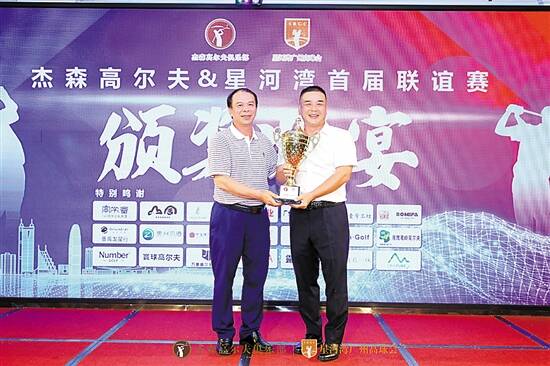 星河湾球会会长王清远(左)颁出“团队奖”,陈文江代表杰森高尔夫队领奖 |