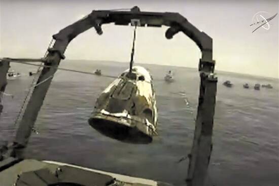 美国航天局8月2日发布的视频截图显示,回收船在墨西哥湾打捞“龙”飞船 新华社发 |