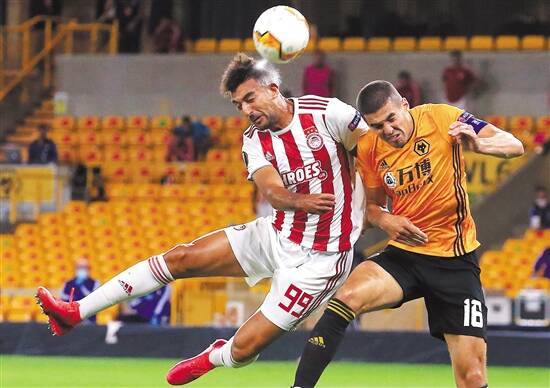 艾哈迈德·哈桑(左)在狼队球员考迪防守下头球攻门 新华社发 |