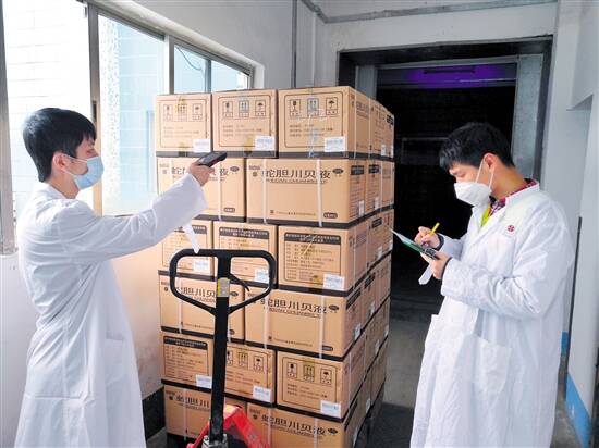 一线员工正井然有序地对蛇胆川贝液进行入库登记 |