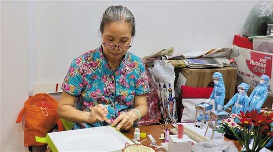 乞巧婆婆潘慧君在准备今年的巧品,特意制作了医护人员形象 羊城晚报记者 郭思琦 摄 |