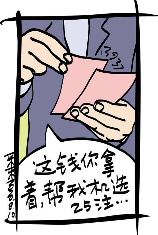 说到彩票,我才记起已有三四个月没买了,便从手里抽出100元,塞给小刘,说:“这钱你拿着,帮我机选25注3D,投双倍。要是中奖,我们对半分……”