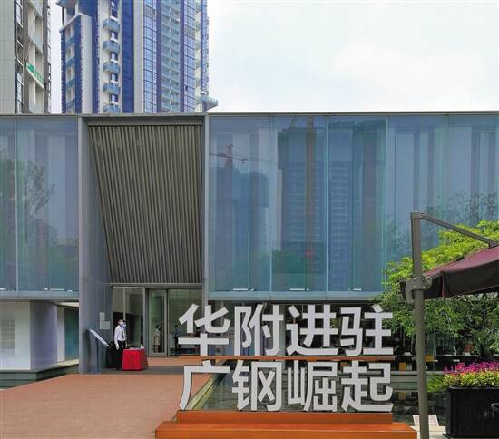 广钢新城南区楼盘售楼部门口,高调宣传“华附进驻” 图/羊城晚报记者 陈玉霞 |