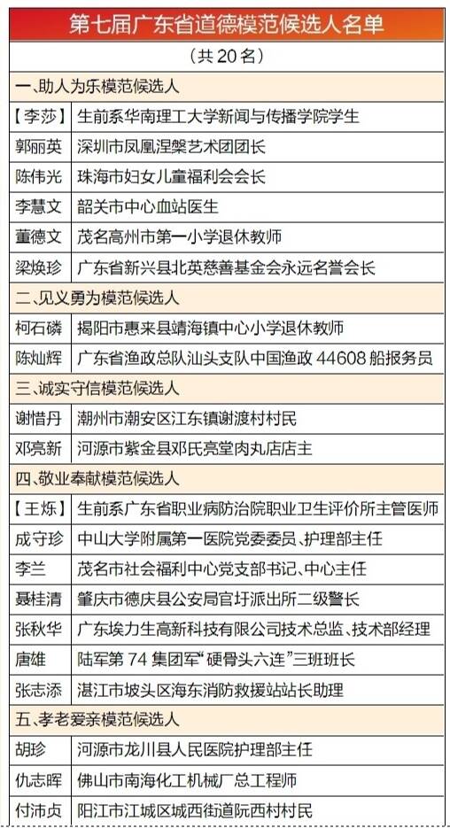 羊城晚报讯 29日,记者从省文明办获悉,根据省委省政府关于开展2018—2020年度广东省精神文明建设工作先进推荐评选的工作部署,省文明办组织开展了第七届广东省道德模范评选活动,经各地各部门推荐和专家评审,确定20名省道德模范和道德模范提名奖候选人,现予以公示,听取社会各界意见。公示时间为2020年8月29日至9月2日。 (丰西西)