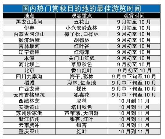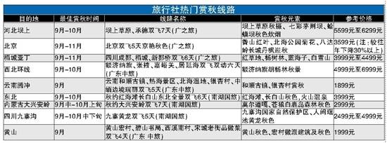 文/羊城晚报记者 刘星彤 暑期近尾声,秋游即将开始。对大多数人来说,天高云淡、清风拂面的秋天才是最理想的出游季节,不仅气候佳,体感舒适,许多红叶胜地也依次登场,露出真容——吉林长白山、北京香山、新疆喀纳斯、江西婺源、四川九寨沟、南京栖霞山……放眼全国,不同的秋色面孔赋予了各地秋天不一样的味道,一年一季的绝美秋色,令人不忍错过。 立秋节气一过,广东各大旅行社的国内秋游产品全面上架,宣告本年度“秋色预定模式”正式开启。在这个因疫情显得有些特别的秋天,或许你会惊喜地发现:暂别了近年来火爆的日韩等地的境外赏秋,国内的秋游更精彩。 2020赏秋地图发布:从北往南自西向东顺序登场 按照传统节气规律,我国自立秋过后,从内蒙古呼伦贝尔及大兴安岭开始,纬度较高的北方部分省份即开始展露秋意。通常从8月中旬起至9月下旬的一个半月左右,是玩家公认的秋游最佳时节——依照从北往南、自西向东的顺序,内蒙古、黑龙江、吉林、河北、新疆、云南、四川……一连串的赏秋热门地区你争我赶,依次登场,以秋色斗艳,要争得在游客心中的一席之地。 据了解,对于国内各地赏秋“追秋”的规律,各大旅行社早已摸透,每年都会专门发布“秋色地图”或相关指引,引导游客“按图索骥”,方便选择心仪的赏秋目的地及产品。 日前,围绕秋遇美景、丰收秋宴、秋收体验、秋恋新玩法、晒秋大比拼5大赏秋特色并按照各地赏秋的“黄金时间”,由广之旅整理的一份《2020中国赏秋地图》新鲜出炉。 据介绍,由于国内各地区温度、湿度、纬度等气候地理条件不同,各地的最佳赏秋时间大致可归纳如下:新疆喀纳斯、吉林长白山、内蒙古额济纳旗、河北坝上草原等北部片区在8月中旬率先入秋,到9月中旬即进入层林尽染的时节,草原湖泊、大漠胡杨林均迎来最佳观赏季;随后是西部片区,以稻城亚丁、西藏林芝为首,也陆续迎来万山红遍、色彩最绚烂的季节;进入10月起,以品蟹赏秋为主基调的东部片区迎来主场,华东各地将吸引一众饕餮客前往品蟹赏景;紧随其后,则将迎来南方最佳赏秋季,广西龙脊梯田、海洋乡、江西婺源等地陆续为秋色渲染,至11月仍是满目金黄。 个性化“惊喜型”秋游亮眼 国内赏秋可完美替代出境游 疫情背景下,今年的赏秋游呈现出较以往略为不同的特征。 根据旅行社的一份近期调查,近45%的受访者计划安排的秋游时间为6至7天,47%的受访者秋游预算在3000元至5000元之间。相较以往,出游天数及预算明显增加。 岭南控股广之旅副总裁文爽对此表示,这在很大程度上乃基于拥有一定消费能力的出境游客逐渐回流至国内游市场,该部分消费者更偏好深度化、主题化及个性化的旅游产品,喜欢中高端的产品及体验。 为此,今年在打造秋游产品时,不少旅行社更为注重将优质服务及丰富的文化内涵融入赏秋特色中,打造更富吸引力的“惊喜”产品。例如,该社一条深度赏秋线路“哈尔滨、伊春、沈阳双飞7天”,围绕小众赏秋目的地黑龙江伊春,更深度、更新颖的赏秋玩法被全新搭配在行程中:安排游客在金山鹿苑与天山马鹿、梅花鹿亲密接触,宛如在日本奈良体验到的“小鹿、雾光、森林”之景;在小兴安岭则可尝试全新的森林热气球,从高空俯瞰五花山色和遍地秋叶,感受更震撼的视觉盛宴。 值得一提的是,以往广东游客对于赴日韩赏秋格外热衷,在今年无法出境游的情况下,国内丰富的赏秋元素有望被重新认识,实际上,这将是拓宽人们赏秋视野的好机会。 “从元素搭配上来说,国内的赏秋产品非常丰富,不输境外。”南湖国旅国内旅游中心产品经理区燕妮建议游客,可以根据个人喜好尝试不同的线路搭配,如大自然赏秋搭配现代都市风光,可体验重庆、成都联游九寨沟的行程;赏秋搭配小资情调,则可体验香格里拉原始秋色联游慢调的丽江古城。 据区燕妮介绍,吉林长白山、内蒙古呼伦贝尔、大兴安岭、额济纳旗、河北坝上以及四川稻城、九寨沟等地,均是目前旅行社收客情况较好的热门赏秋目的地。而相比往年,由于机票折扣较大及部分线路航班增加,今年的赏秋线路价格更低,以南湖国旅一条东北7日深度赏秋线路(包含红海滩、长白山、关门山、画家村及本溪水洞等景点)为例,去年最低售价为3900元/人,今年只需3300元/人起。 此外,记者从旅行社了解到,目前广东至大连的旅行团已经恢复开放。作为极具特色的东北海滨城市,大连在每年10月将迎来秋景,届时可选择联游青岛、泰山等地的线路,一路叹尽北方特有的海滨风光及青岛八大关枫叶、银杏与泰山秋色。