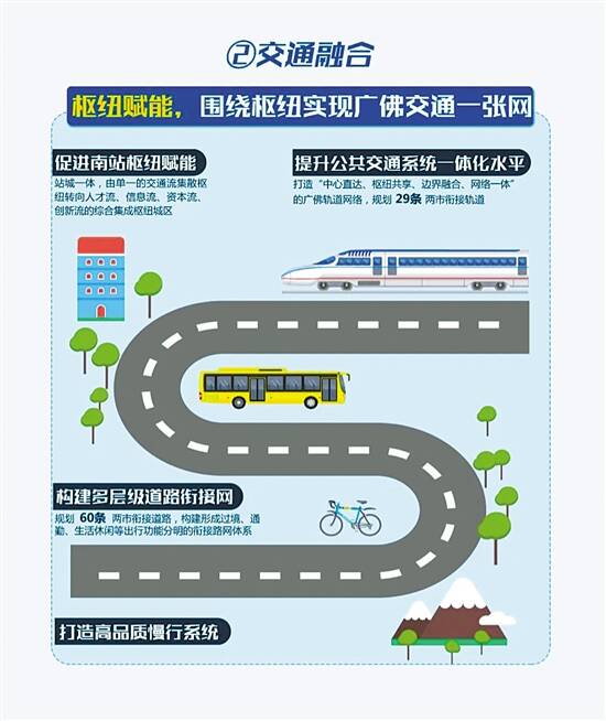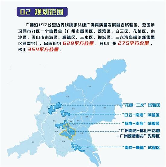 羊城晚报记者 赵燕华 通讯员 穗规资宣 广州、佛山两市携手推进同城化11年来,在交通互联、环境共治、民生共享等领域取得丰硕成果,催生了全国唯一的“双万亿”同城化城市组合。 近日,广州、佛山两市携手编制《广佛高质量发展融合试验区建设总体规划》(以下简称《总体规划》),提出在广佛197公里长的边界两侧,选取629平方公里极具发展潜力的区域,合力建设包括“1个先导区和4个片区”的高质量发展融合试验区,推动两市在各个领域实现全面互联和深度融合,逐步实现广佛全域同城化。9月2日晚,广州市规划和自然资源局公众号发布《一图读懂-广佛高质量发展融合试验区建设总体规划》,详细解读了总体规划的亮点与重点。羊城晚报记者对此进行梳理与提炼。 规划总面积约629平方公里 根据方案,广佛沿197公里边界线携手共建广佛高质量发展融合试验区,范围涉及两市九区一个管委会(广州市番禺区、荔湾区、白云区、花都区、南沙区;佛山市南海区、顺德区、三水区、禅城区、三龙湾高端创新集聚区管委会),总面积约629平方公里,其中广州275平方公里,佛山354平方公里。 规划将面向区域协同治理和建设实施的需求,突出高质量和融合两个关键词,形成涵盖“目标—策略—分区指引—近期行动—机制政策创新”的系统规划。并提出三大定位:全国都市圈治理与协同发展新典范、粤港澳大湾区创新开放新高地、广佛高品质岭南理想人居新标杆。 羊城晚报记者梳理发现,《总体规划》提出了三个阶段目标,分别是: ——2022年,试验区初步创建跨区域协同治理体系框架,成为湾区政策创新高地。先导区启动2—3个区域共建标志性项目,初步建成集中展示广佛极点功能的启动区; ——2025年,试验区初步实现跨区域协同治理体系和治理能力现代化,引领广佛同城融合、贯通大湾区东西两翼的大湾区中轴地位基本成形; ——2035年,实现跨区域协同治理体系和治理能力现代化,试验区成为粤港澳大湾区的创新发展增长极和标志性战略大平台。 构筑广佛科技创新走廊 《总体规划》空间布局为“一核、一带、一廊”。 “一核”是指打造广佛高质量发展融合的新极核。以先导区为核心,形成广佛高质量发展融合新极核,与原两市中心区共同构成广佛全球超级都会新都心。 “一带”是建设通山达湾的广佛南北生态文化带。依托珠江水网,通过碧道、绿道等串联整合各类生态文化资源,共建以流域生态为基底,无边界、永续发展的南北生态文化带,打造广佛超级都会公园。 “一廊”是融入国际科技创新网络的广佛科技创新走廊。链接广佛两地创新优势、整合创新资源、完善创新产业链条,整合和布局两市创新空间,构筑广佛科技创新走廊,融入湾区国际科技创新网络。 推动产业多领域对接交流 在要素融合上,《总体方案》也明确指出将推动生态、交通、产业、城乡、文化、社会六大要素融合。在交通融合上,通过枢纽赋能,围绕枢纽实现广佛交通一张网。促进南站枢纽赋能,站城一体,由单一的交通流集散枢纽转向人才流、信息流、资本流、创新流的综合集成枢纽城区。 提升公共交通系统一体化水平,打造“中心直达、枢纽共享、边界融合、网络一体”的广佛轨道网络,规划29条两市衔接轨道。构建多层次道路衔接网,规划60条两市衔接道路,构建形成过境、通勤、生活休闲等出行功能分明的衔接路网体系。 试验区将充分利用南站枢纽每年带来近2亿人次的客流资源,发挥广州南站作为粤港澳大湾区和国家腹地“双向门户”的作用,推动南站周边形成“站城一体”的现代化新城区,近期重点推进南站商务区、世贸小镇、博智林机器人谷、三山科创中心等项目建设。 在产业方面,广佛两市大力推动汽车、医药、机械制造等多领域的对接交流,产业协作项目达31个,互相投资企业数达4291家,企业“总部-分支”联系数量约2500余家。充分利用融合试验区的产业发展条件,围绕先进装备制造、汽车、新一代信息技术、生物医药与健康四大领域,共育30个产业平台,放大“1+1>2”的倍增效应,推动两地打造数个万亿级产业集群。 近期集中建设启动区 《总体规划》提出,为推进广佛同城化进展,近期主要开展集中建设试验区启动区和推进分类示范项目建设两项行动。 近期集中建设试验区启动区是指在“广州南站—佛山三龙湾—广州荔湾海龙”先导区,先行建设番禺—南海—顺德启动区和荔湾—南海—番禺启动区,推动重点项目合力共建、生态共治共担、产业协同发展,集中显示广佛高质量发展融合的成效。其中荔湾—南海—番禺启动区位于荔湾海龙、东沙片区和南海三山北片区、番禺洛浦西片区,面积约20.7平方公里。番禺—南海—顺德启动区,位于先导区南站西侧及林岳片区,面积约15.7平方公里。 近期推进分类示范项目建设包括以碧道为核心的生态链接工程,轨道和干线道路为核心的交通链接工程,创新为核心的产业链接工程,增存联动的土地整备项目,彰显岭南特色的风貌建设项目。 根据方案,近期将建设陈村水道、佛山水道等19段碧道和海龙花卉博览园等生态项目,共建广州28号线、佛山4号线等14条跨市轨道和增佛高速等29条道路,推进广佛荟、粤文化项目等产业平台建设,选取南站西侧韦大片区、林岳—陈村片区等15片广佛交界共建区域,加快推荐土地整备和系统更新改造。方案