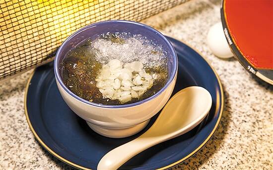 店主还向记者透露制作皂角米甜品的“小秘诀”:首先,将桃胶、皂角米和雪燕提前一天用冷水泡发10-12小时;然后,将泡发好的桃胶、皂角米放进炖锅小火炖30分钟,之后加入雪燕和适量冰糖再炖15分钟,冷却放入冰箱冷藏,冰冻的皂角米甜品口感更佳。