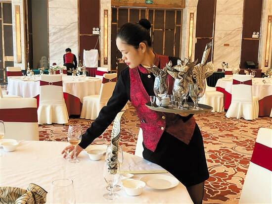 9月2日,广东省首批餐厅服务员职业技能等级证书在广州酒家逸景店正式开考。宴会厅现场,参与考试的服务员要在20分钟内将8人台布置好,按照规范摆放17样物品。来自广州酒家集团下属企业22名员工参加了考试,考试合格后,他们将成为广东首批荣获“餐厅服务员”职业技能等级证书的人员。