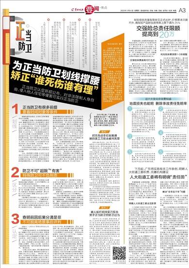 对于非法限制他人人身自由、非法侵入他人住宅等不法侵害,可以实行防卫。 要充分考虑防卫人面临不法侵害时的紧迫状态和紧张心理,防止在事后以正常情况下冷静理性、客观精确的标准去评判防卫人。 对于不法侵害是否已经开始或者结束,应当立足防卫人在防卫时所处情境,按照社会公众的一般认知,依法作出合乎情理的判断,不能苛求防卫人。 应准确把握防卫过当的刑罚裁量。防卫过当应当负刑事责任,但是应当减轻或者免除处罚。 对于正在进行的拉拽方向盘、殴打司机等妨害安全驾驶、危害公共安全的违法犯罪行为,可以实行防卫。 羊城晚报记者 董柳 《最高人民法院 最高人民检察院 公安部关于依法适用正当防卫制度的指导意见》(以下简称《指导意见》)3日公布,对于切实防止“谁能闹谁有理”“谁死伤谁有理”的错误做法,坚决捍卫“法不能向不法让步”给出了较为明晰的认定标准。 “近年来,‘于欢案’‘昆山龙哥案’等涉正当防卫案件引发广泛关注,亿万网民参与讨论。这一方面反映出,进入新时代,人民群众对社会的公平、正义、个人权利、安全等有了新的认识和更高期待;另一方面也暴露出,对正当防卫制度的适用,在司法理念上要进一步提升,在具体规则上要进一步明确。”最高法研究室主任姜启波说。 1 划线 正当防卫有很多前提 要看时间对象等条件 根据我国刑法规定,正当防卫的前提是存在不法侵害。 《指导意见》明确:不法侵害既包括侵犯生命、健康权利的行为,也包括侵犯人身自由、公私财产等权利的行为;既包括犯罪行为,也包括违法行为。不应将不法侵害不当限缩为暴力侵害或者犯罪行为。对于非法限制他人人身自由、非法侵入他人住宅等不法侵害,可以实行防卫。不法侵害既包括针对本人的不法侵害,也包括危害国家、公共利益或者针对他人的不法侵害。对于正在进行的拉拽方向盘、殴打司机等妨害安全驾驶、危害公共安全的违法犯罪行为,可以实行防卫。成年人对于未成年人正在实施的针对其他未成年人的不法侵害,应当劝阻、制止;劝阻、制止无效的,可以实行防卫。 反击后咋就成了被告人?追小偷致其死亡反而被起诉?如何把握正当防卫的时间点很关键。 为此,《指导意见》明确:正当防卫必须是针对正在进行的不法侵害。对于不法侵害已经形成现实、紧迫危险的,应当认定为不法侵害已经开始;对于不法侵害虽然暂时中断或者被暂时制止,但不法侵害人仍有继续实施侵害的现实可能性的,应当认定为不法侵害仍在进行;在财产犯罪中,不法侵害人虽已取得财物,但通过追赶、阻击等措施能够追回财物的,可以视为不法侵害仍在进行;对于不法侵害人确已失去侵害能力或者确已放弃侵害的,应当认定为不法侵害已经结束。“对于不法侵害是否已经开始或者结束,应当立足防卫人在防卫时所处情境,按照社会公众的一般认知,依法作出合乎情理的判断,不能苛求防卫人。对于防卫人因为恐慌、紧张等心理,对不法侵害是否已经开始或者结束产生错误认识的,应当根据主客观相统一原则,依法作出妥当处理。” 此外,还要准确把握正当防卫的对象条件。“正当防卫是‘正对不正’,必须针对不法侵害人进行。但是,不能狭隘地将不法侵害人理解为直接实施不法侵害的人,而是也包括在现场的组织者、教唆者等共同实施不法侵害的人。”姜启波介绍,《指导意见》第七条还规定,“明知侵害人是无刑事责任能力人或者限制刑事责任能力人的,应当尽量使用其他方式避免或者制止侵害;没有其他方式可以避免、制止不法侵害,或者不法侵害严重危及人身安全的,可以进行反击。” 2 区分 防卫不可“超限”“有害” 特殊防卫可不负刑责 我国刑法规定,正当防卫明显超过必要限度造成重大损害的,应当负刑事责任,但是应当减轻或者免除处罚。 对于防卫过当,《指导意见》明确,认定防卫过当应当同时具备“明显超过必要限度”和“造成重大损害”两个条件,缺一不可;判断是否“明显超过必要限度”,要立足防卫人防卫时所处情境,结合社会公众的一般认知作出判断。 《指导意见》同时要求,防止将滥用防卫权的行为认定为防卫行为。“凡事皆有度,过犹不及。要切实防止从一个极端走向另一个极端,把防卫过当认定为正当防卫,甚至把不具有防卫因素的故意犯罪认定为正当防卫或者防卫过当。”姜启波说。 对于“特殊防卫”,《指导意见》明确,在实施不法侵害过程中存在杀人、抢劫、强奸、绑架等严重危及人身安全的暴力犯罪行为的,如以暴力手段抢劫枪支、弹药、爆炸物或者以绑架手段拐卖妇女、儿童的,可以实行特殊防卫。 根据刑法,实施特殊防卫,造成不法侵害人伤亡的,不属于防卫过当,不负刑事责任。 “这些犯罪严重威胁人身安全,被侵害人面临正在进行的暴力侵害,很难辨认侵害人的目的和侵害程度,也很难掌握防卫行为的强度。”最高人民检察院法律政策研究室副主任劳东燕说,“如果规定得太严,就会束缚被侵害人的手脚,妨碍其与犯罪作斗争的勇气,不利于公民运用法律武器保护自身合法权益。” 3 认定 查明前因后果分清是非 不可脱离场景事后评判 实践中,“人死为大”的观念在社会上仍然根深蒂固。 “电梯劝阻吸烟猝死、私自爬树摘杨梅坠亡等事件之所以会成为诉讼案件,明显是受到这一观念的影响;有的涉