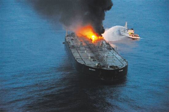 9月3日,在斯里兰卡以东海域,“新钻石”号油轮火光冲天。 斯里兰卡海军发言人德席尔瓦4日证实,一艘载有超过20万吨原油的油轮3日凌晨在斯里兰卡以东海域起火,大火4日仍未被扑灭。根据从船员那里得到的信息,大火已造成一名船员死亡,另有一人受伤。这艘名为“新钻石”号的油轮计划从科威特驶往位于印度东部的帕拉迪布港,3日凌晨行驶至距斯里兰卡东海岸38公里处时着火。 新华社发