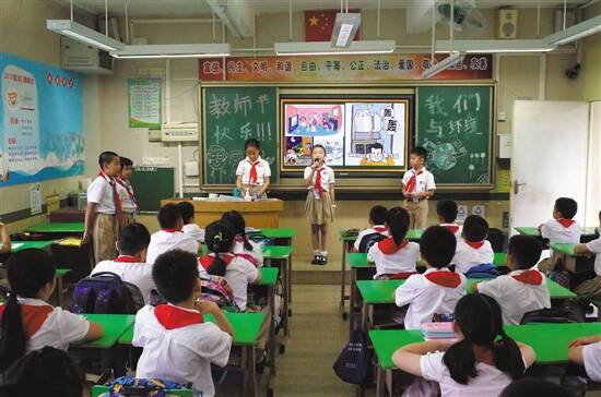 羊城晚报讯 记者蒋隽报道: 9月10日教师节,广州市越秀区东风东路小学的老师们突然“变小”了!师生角色互换,学生当一次讲台上的“小老师”上一节特别的课,老师当一次讲台下“小学生”听一次难忘的课。学生们用一节节生动有趣的讲课为老师们送上了一份独特的教师节礼物,也体验做老师的辛劳和乐趣,感受“长大后我就成了你”。 记者随机走进小老师的课堂,立马被这些稚嫩的声线、活跃的课堂气氛所吸引。 在六年(1)班的课堂,“小老师”谢艾喆给同学们上语文课,纪伯伦的《花之歌》。介绍了作者生平、生字词之后,她点名同学朗读第五自然段,提问“‘而这些哲理人类尚未领悟’中的‘哲理’指的什么?”15分钟里,板书、对比阅读、PPT展示、小组讨论、“老师”总结、布置作业……所有教学环节一个不少,课堂生动。 为了这节课,谢艾喆“备课”三天,准备了满满三页讲稿,做了20页PPT,不断请教老师,“最怕提问没人回答,很尴尬。”她笑说,“这次当小老师,体会到了当老师的辛劳,也体验到了乐趣,看到同学们喜欢我的课,认真听讲、积极回答问题,觉得很有成就感。” 六年(4)班两位男生小老师开课挑战勾股定理,惨遭“滑铁卢”,同学们普遍表示没听懂,“老师”抓耳挠腮重新画图再讲了一遍。 台下的老师感慨地说:“同学们讲得很好,真了不起,我作为一名‘学生’要好好上课。” 此次“翻转课堂”大行动,独特的授课形式一下子就吸引了一千多位学生报名小老师,他们“摩拳擦掌”,精心准备了一百多节不同内容风格的课程。 校长彭娅表示:“多年来,学校一直倡导学生在教师节不送鲜花、不送礼物,要送就送最有意义和难忘,来自于精神层面的教师节礼物。让学生当老师可以让他们体验老师的付出和艰辛,也体验在讲台上指挥‘千军万马’的感觉,树立远大志向。”