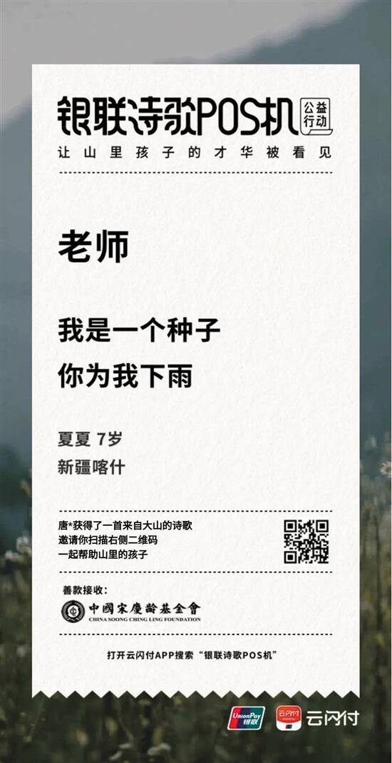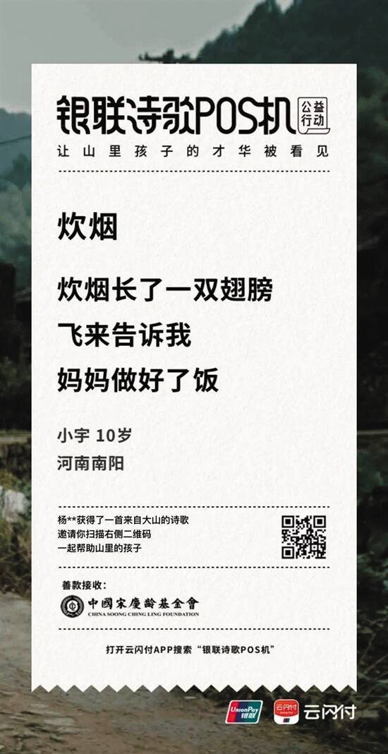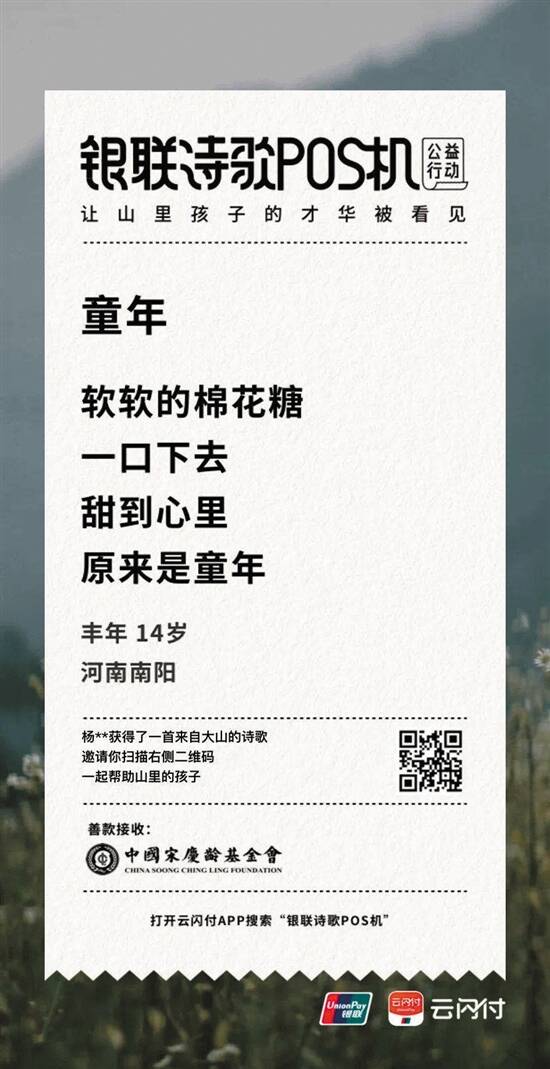 文/戴曼曼 8月29日,中国银联携手中国宋庆龄基金会在湖南张家界发起2020年“中国银联诗歌POS机”公益行动,并向中国宋庆龄基金会捐赠300万元善款,用于为欠发达地区少年儿童修建公益图书馆及开设艺术素养教育课程。 在公益活动现场,观众可以亲身体验“银联诗歌POS机”,使用云闪付APP、银联手机闪付、银联二维码或银联卡在诗歌POS机上支付,既能收获一张印刷着山区孩子诗歌的精美“小票”,同时可以捐赠爱心善款,支持孩子们接受更良好的文化艺术教育。央视新闻在现场进行了全程直播,两名来自山里的孩子朗读自己创作的诗歌,一条长达百米的印制诗歌“长河”从张家界的山峰间垂下,将中国古代诗歌和山里孩子的诗歌串联起来,展示中国诗歌文化的传承。 活动当天,云闪付APP“银联诗歌POS机”小程序正式上线。用户在云闪付APP中进入小程序,按下“点击帮助孩子”按钮,即可阅读、转发孩子的诗歌,还可以收到公益图书馆及艺术素养课程的最新进展。香港和澳门地区用户也可在港澳版云闪付APP中参与公益,倾听山区孩子的心声。 在本次公益行动中,银联还与农夫山泉合作,在超过1亿瓶农夫山泉天然水的瓶身上印制了山里孩子的诗歌,将山区儿童的才华通过银联诗歌POS机“诗歌瓶”展示给更广大的人群。 中国银联诗歌POS机公益行动从2019年7月正式启动,当年所募善款已陆续投入到安徽怀远、河南南阳、四川绵阳、新疆喀什、云南南华地区,帮助3140名家庭困难儿童接受艺术教育。2020年,云闪付APP用户数突破3亿,银联再度启动“银联诗歌POS机”公益行动,积极践行社会责任,助力高质量打赢脱贫攻坚战及精神扶贫,促进全社会对欠发达地区少年儿童的关注,帮助他们接受更优质的教育。
