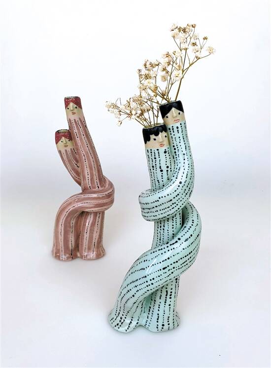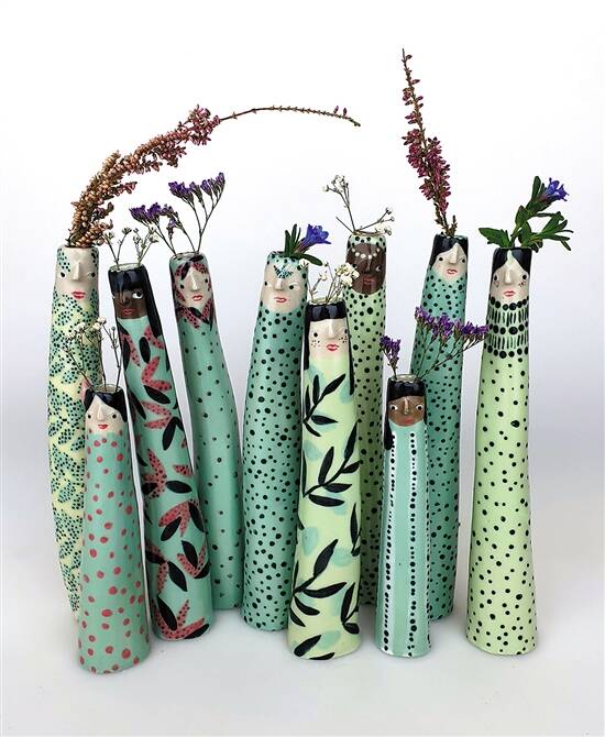 荷兰陶瓷设计师桑德拉在自己的个人网页上推出大量有趣的蜡笔花瓶,它们被制作成古怪的人物造型,设计师命名该系列花瓶为Weirdo Bud Vases。 这些被拟人化的花瓶,都有着细长的“身体”,它们或带有波尔卡圆点,或布满花卉图案,或者只有一些条纹,像一个个瘦高个的小人穿着不同的外套,或立或坐或搂抱在一起。设计者将自己对粉嫩色彩和小雀斑的爱好渗透到作品中,注定了这些花瓶的俏皮风格。 “我希望我的作品能使人们发笑或者做做白日梦。这样便能分散他们日常工作中的压力,带给他们温暖的感觉,并激发他们的想象力。”设计师桑德拉在自己的官微上这样写道。她说自己在创作时并没有事先设计好什么样的形态,只是在塑形过程中,便不由自主地制作出各种形态的“花瓶小人”。她说:“用开放式的心态去尝试新事物,这对我的工作非常重要,我因此能继续保持胸襟开阔。我希望看到这些作品的人也能如此。” (文/CC 图/Sandra Apperloo)