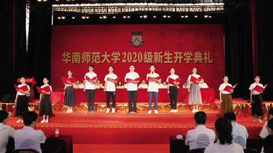 羊城晚报讯 记者陈亮、实习生夏嘉欣,通讯员陈霞、李建儒、杨柳青摄影报道:17日上午,华南师范大学在石牌校区举行2020级新生开学典礼。据了解,此次开学典礼线上线下同步进行,分三校区、1个主会场、33个分会场,400名本科、研究生新生代表参加主会场典礼仪式,其余12000多新生在学院组织的分会场“云端”相见。 “一校柱石,筑起南方教育高地;三足鼎立,成就中国卓越黉宫。”仪式开始,新生观看了首次面世的《华师赋》视频。该视频是学校送给新生的礼物,再现了华师创校87载的办学历程,展现了学校赓续华夏文脉、传承师道精神的奋勇进程。值得一提的是,视频中历史片段均由学校师生演绎,实现不同年代的华师人隔空对话,传递华师精神。 典礼上,校长王恩科以“接续奋斗,勇担使命”为题,寄语新生与时代同行,在成长中感悟生命真谛,在奋斗中实现人生价值,在前行中勇担时代重任,将个人梦想与中华民族伟大复兴中国梦相融汇,努力担当民族复兴大任。 此外,学校还对普通高考招生录取中优秀考生给予了奖学金,今年共奖励83位优秀考生合计134万元,其中获得80000元的同学4名,20000元的23名,10000元的56名。