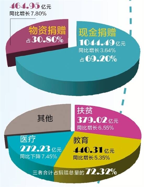 羊城晚报记者 林园 19日,中国慈善联合会在深圳举办的第八届中国慈展会上发布《2019年度中国慈善捐助报告》(以下简称《报告》)。《报告》显示,去年,我国共接收境内外款物捐赠1701.44亿元人民币,现金捐赠连续两年突破千亿元。这些慈善捐赠投向教育、扶贫和医疗三个领域的资金依然最多。 现金捐赠连续两年破千亿元 《报告》显示,2019年,我国共接收境内外款物捐赠1701.44亿元人民币。其中,内地接收款物捐赠共计1509.44亿元,同比增长4.88%,为历年最高。人均捐赠107.81元,比去年略有增加。香港特区接收捐赠约164亿元,同比增长2.5%;澳门特区接收捐赠约28亿元,同比增长12%(台湾尚无权威统计数据)。 2019年,我国慈善捐赠以现金为主,现金捐赠总量达1044.49亿元,同比增长3.64%,占69.20%,再创历史新高,并且已连续两年突破千亿元。全国物资捐赠也有所增加,总额达464.95亿元,同比增长7.80%,占总量的30.80%。慈善会系统和基金会接收的物资捐赠价值均超过150亿元。目前,我国慈善捐助的物资主要涉及医药用品、食品饮料、图书软件、电器设备、机动车辆、建筑材料、救灾物资等类别,在扶贫、医疗、教育、救灾等方面发挥着重要作用。 全国红十字会系统共接收境内外捐赠47.21亿元,同比增长19.86%;全年捐赠支出共44.12亿元,占捐赠收入的93.45%,主要用于救灾、救护、救助等,在人道主义事业方面发挥重要作用。 个人捐赠呈现蓬勃增长势头 《报告》显示,2019年,我国慈善捐赠投向教育、扶贫和医疗三个领域的资金依然最多,捐赠额分别为440.31亿元、379.02亿元、272.23亿元,合计占捐赠总量的72.32%,体现关注民生,促进社会公平。 其中,教育领域的捐赠同比增长5.35%,多数流向了高等院校。扶贫捐赠增长6.55%。2019年全国减少建档立卡贫困人口1109万人,340个贫困县脱贫摘帽,这其中包含了慈善力量的努力和贡献。医疗健康领域的捐赠下降了7.45%,主要由于医药用品等物资捐赠缩减所致。 我国慈善捐赠的主要来源依然是企业。2019年,企业捐赠款物931.47亿元,同比增长4.56%,占捐赠总量的61.71%。个人捐赠也显示出了蓬勃生机,达398.45亿元,同比增长10.54%,再创新高。无论是单笔超过10万元的大额捐赠,还是通过银行或者互联网募捐平台的小微捐赠,个人捐赠均呈现增长的势头。 此外,2019年,全国20家互联网募捐平台汇集的慈善捐赠超过54亿元,同比增长68%。同年9月,腾讯公益平台开展了“99公益日”活动,仅用3天时间就吸引全国4800多万人次捐款超过17.8亿元,充分展示了网络募捐的强大力量。随着互联网、大数据等信息技术的高速发展,“互联网+慈善”已成为公益慈善事业新的增长点。