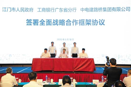 2020年6月18日,江门市人民政府、中国工商银行广东省分行、中电建路桥集团有限公司签订深化粤港澳大湾区建设全面战略合作框架协议 |