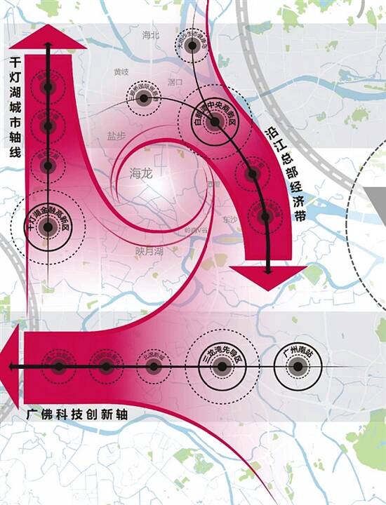 羊城晚报讯 记者李焕坤、张闻,通讯员荔宣、何欢报道:25日下午,主题为“广佛新城 科创智谷”的广佛融合示范区规划研讨会在佛山市南海区举办。会上,荔湾区政府和南海区政府签订《广州市荔湾区与佛山市南海区合作共建广佛新城 科创智谷—广佛融合示范区备忘录》。 概念:“广佛之心、湾区极点” 广佛两市同处珠三角核心区域,地域相连、历史相承、文化同源、产业互补,自2009年签署《广州市佛山市同城化建设合作协议》以来,在交通互联、环境共治、民生共享等领域取得成果,成为全国首个“双万亿GDP”同城合作典范。经过多年的发展,广佛同城迈入一个崭新的阶段——就在日前,《广佛高质量发展融合试验区建设总体规划》发布,围绕广佛197公里长的边界两侧,划定629平方公里极具发展潜力的区域,合力建设“1个先导区和4个片区”。在“1+4”高质量融合发展试验区中,“广州南站-佛山三龙湾-广州荔湾海龙”先导区和“荔湾-南海”试验区地处广佛两市主城区之间。在此背景下,华南理工大学教授袁奇峰提出广佛新城概念。 何为广佛新城?袁奇峰介绍,广佛新城涉及荔湾的滘口、大坦沙、海龙围,面积约28km^2,以及南海的黄岐、盐步、映月湖片区,面积约42km^2,“这一地块位于荔湾沿江总部经济带、南海千灯湖城市中轴线、三龙湾先导区三个市级平台之间,处于城乡接合状态的‘价值洼地’,但同时也是都市圈核心融合发展的‘主战场’。我们选择打造广佛新城,不是要建成一个像珠江新城的载体,而是把三龙湾、白鹅潭总部经济带、千灯湖三个‘大家伙’变成一个‘超级大家伙’,成为‘广佛之心、湾区极点’。” 做法:产业交通生态空间再造 袁奇峰认为,广佛新城的建设可以先从三大片区入手,其中黄岐片区打造数字贸易港,海龙围片区打造时尚创意产业,以及以广佛中央花园为核心构造新的生态圈。 怎么做?袁奇峰从产业再造、交通再造、生态再造、空间再造四方面提出了他的观点,其中,产业再造方面,佛山创新优势集中在传统产业上,广州在战略性新兴产业上具有较强创新能力,两地可进行产业创新融合;交通再造方面,利用如意坊放射线、珠江大桥放射线、广昆高速复线、快捷环跨江等交通增量建设机会,优化广佛新城道路交通系统;生态再造方面,广佛公园链以浔峰岗、花卉博览园、陈村花卉基地、三山公园为生态源,调动并围绕丰富的水道打造“碧道系统”,串联公园、街头绿地,以共治、共享的环境提升引领边界地区二次发展;空间再造方面,通过生态和交通前置提升边界地区空间价值,在生态网络的格局下,围绕轨道交通TOD站点重构功能组团,形成嵌入区域、缝合主城的网络化发展格局。 研讨会上,南海区区长顾耀辉表示跨行政区域建设广佛新城是件要事,现在只是个概念,落地还需过程,下一步将在做好规划的基础上,形成共同的行动方案推进。荔湾区区长毕锐明表示,广佛新城的发展不能只靠政府,还需要市场的力量,可以考虑共同成立机构运营这一区域。
