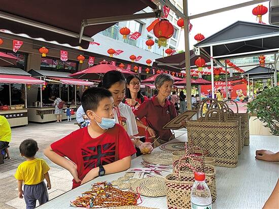 羊城晚报讯 记者余晓玲摄影报道:10月1日、2日,东莞非遗墟市连续两天登场。茶山公仔、石龙麒麟制作、凤岗客家腊肠制作技艺、万江新村腐竹、莞草编织技艺……来自东莞各镇街的18项非遗项目连续两天在东莞市文化馆摆摊展销,还有醒狮高桩展演、七夕贡案、舞麒麟等精彩非遗展演轮番上阵。折扣优惠、免费体验、非遗展演……福利多多,吸引不少市民前来趁墟“打卡”。 10月2日上午,记者来到东莞非遗墟市,现场气氛热烈,由清溪黄家班麒麟队带来的舞麒麟正在上演。正值东莞非遗墟市4周年庆,各个展销摊位均推出各类折扣优惠,如“李全和”麦芽糖和糖柚皮九折优惠;凤岗客家腊肠60元/包(原价70元);万江新村腐竹购满100元,送纯黑豆豆腐花一份;莞草编织品九折优惠……多样的折扣优惠,吸引众多市民“买买买”。 非遗墟市现场还有茶山公仔制作免费体验活动,在传承人的指导下,不少小朋友现场体验给茶山公仔上色。带着孩子前来参加体验活动的一位家长表示,茶山公仔作为东莞茶山特有的一种传统民间手工艺术品,具有丰富的民俗文化内涵和深厚的艺术底蕴,“这类体验活动非常有意义,可以增进孩子对传统文化的了解”。 舞麒麟展演则吸引不少市民驻足欣赏,市民们还纷纷拿出手机,记录下展演的精彩瞬间。10月1日上午,由石排中坑明德醒狮团带来的醒狮展演,动感的鼓声,高超的技巧,营造出热烈喜庆的节日氛围,还吸引了一批外国朋友前来“打卡”,领略中华优秀传统文化的独特魅力。 在东莞,每逢中秋节,除了月饼,还有一件单品不可或缺——灯笼仔。10月1日,在非遗展厅传习区举办的非遗课堂上,数十位市民体验了灯笼仔的制作技艺。 此外,东莞非遗墟市现场设置的莞味十足的节日打卡点,也吸引众多前来趁墟的市民拍照“打卡”,为东莞非遗“代言”。