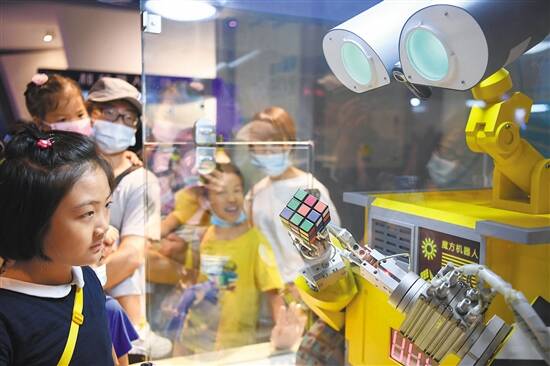10月4日,广州市民在广东科学中心观看机器人玩魔方 新华社发 |