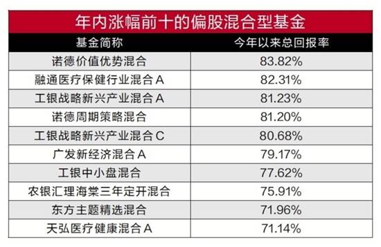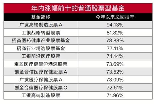 羊城晚报记者 莫谨榕 今年前三季度落下帷幕,公募基金年内业绩表现如何?羊城晚报记者据同花顺iFinD数据统计显示,截至9月30日记者截稿时,普通股票型基金年内净值均涨幅已达37.72%;偏股混合型基金年内净值均涨幅36.72%。而年内上证指数涨幅仅为5.51%,沪深300指数年内涨幅为11.98%,由此可见公募基金年内赚钱效应明显。 偏股型基金业绩明显领跑 今年前三季度A股市场持续变化,基金业绩也出现明显分化。近年来市场频繁出现百亿级“爆款”基金,投资者对于基金投资的热情持续攀升。在A股结构性行情和7月的强势反弹助推下,公募基金的赚钱效应备受关注。新基金发行火爆,同花顺iFind数据库统计显示,今年以来新成立的基金数量达到1053只,超过2019年的1042只,创下单年度新成立基金数量新高。 剔除掉今年以来上市的新基金,市场上以普通股票型基金和偏股混合型基金为主的主动权益类基金共有1410只(A\C类份额分开计算),上述基金年内平均涨跌幅为37.10%。其中,共有291只基金的年内涨幅超过50%,超过1100只基金年内涨幅超过30%。 从基金类型来看,随着近期A股市场出现振荡,主动权益类基金的收益率有所收窄。不过,相较之下,主动权益类基金仍是表现较好的基金品类。紧随其后的是增强指数型股票基金,年内收益率为26.70%,灵活配置型基金排在第四位,收益率为26.55%,被动指数型股票基金排在第五位,收益率为19.58%。 债券型基金表现不尽如人意,整体来看,年内债基的平均净值增长率约为4.33%,偏债混合型基金年内平均涨幅仅为8.89%,年内涨幅超过20%的偏债基金仅有3只。收益率最高的产品为民生加银嘉盈债券,年内净值增长率达29.36%,易方达鑫转添利混合C、易方达安心回馈混合均属于偏债混合型基金年内涨幅也超过两成。 与此同时,QDII基金表现也一般,尤其以原油类QDII基金表现较差。数据显示,300只QDII基金的年内平均收益率仅为4.23%,添富全球消费混合(QDII)美元现汇以68.43%的净值增长率居首,南方香港成长、富国蓝筹精选股票(QDII)、添富全球消费混合(QDII)人民币A/C、广发全球精选股票美元(QDII)、广发全球精选股票人民币(QDII)年内涨幅均超过六成。 新能源医药基金涨幅优异 从最新的数据看,前三季度涨幅最高的主动权益类基金是分别是广发高端制造股票A、诺德价值优势混合、融通医疗保健行业混合A、工银战略转型股票、工银战略新兴产业混合A/C、诺德周期策略混合,上述基金的年内涨幅都超过80%。广发新经济混合A、招商医药健康产业股票基金、工银中小盘混合、招商行业精选股票基金、农银汇理海棠三年定开混合年内涨幅都超过75%。 涨幅最高的是广发高端制造股票A,今年以来的总回报率高达94.13%。诺德价值优势混合,年内回报率为83.82%,融通医疗保健行业混合A、工银战略转型股票、工银战略新兴产业混合A、诺德周期策略混合的年内涨幅分别为82.31%、81.82%、81.23%、81.20%。 2019年,偏股混合型基金中的冠军是广发基金经理刘格崧管理的三只基金,全年收益率均翻倍,共有17只偏股混合型基金收益率超过90%。今年市场走过3/4行程,相比于沪指不到6%的涨幅,公募基金仍表现出较好的业绩,部分基金的涨幅已经赶上去年全年,新基金发行市场火热势头也在持续。 总的来看,今年前三季度表现良好的基金,以重仓了成长股和医药股的基金居多,不少基金都站在了新能源等火爆题材股的风口上。以暂居冠军的广发高端制造股票A为例,截至6月30日,该基金重仓的板块分别是电气设备和电子,合计持仓市值占基金总市值约有六成,重仓股隆基股份、亿纬锂能、锦浪科技、通威股份等均紧扣新能源热点板块,今年以来,新能源板块累积涨幅已经高达48.67%。 排在第二位的诺德价值优势混合也重仓了一部分新能源高年股,通威股份、隆基股份均上榜其上半年的前十大重仓股。此外,诺德价值优势混合还重仓了五粮液、泸州老窖等一部分白酒股。 而业绩表现同样优异的融通医疗保健行业混合、招商医药健康产业股票基金则明显重仓了医药生物类个股,从而带动基金业绩大涨。比如,截至上半年,融通医疗保健行业混合中医药生物板块持仓市值占比超过九成,前十大重仓股中清一色是医药股,包括健帆生物、泰格医药、长春高新、智飞生物、恒瑞医药等等,招商医药健康产业股票基金也同样几乎全仓持有医药股。医药基金行业风格明显,医药生物板块今年内涨幅达到44.39%,医药类基金也成为今年涨幅最好的行业类基金之一。