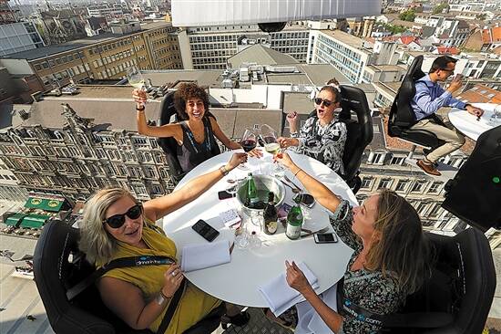 比利时一家“空中餐厅”实在挑战食客的勇气。它的餐桌设置在50米高的半空中,前来就餐的人必须坐在完全悬空的餐椅上进餐,当然,同时也能鸟瞰布鲁塞尔的城市美景。 该餐厅其实是由一个9吨重的起重机挂起的8张4人席餐桌构成。也就是说,每次餐厅升空,最多都只能接待32位客人用餐。 所有桌椅自然都经过特殊的设计,顾客坐在那里也必须系上安全带装置,但悬空的感觉也并不是人人都能“享受”的,所以要挑战这样一家“空中餐厅”里的美食及美景,的确要提前做好心理准备。 (文/CC 图/视觉中国)