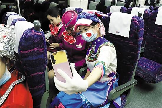 文/图 羊城晚报记者 王丹阳 黄婷 实习生 黄准延 《我和我的家乡》中出镜的西江千户苗寨、甲天下的桂林山水、中国第一个自然保护区广东鼎湖山……被称为“中国最美山水线”的贵广高铁从贵阳出发,一路向东南飞驰,沿途风光从高原到平原,从喀斯特地貌到珠江三角洲,一直到繁华的羊城广州。 开通6年,贵广高铁将原来22小时左右的火车时间缩短至4个多小时,大大缩短了西南地区与粤港澳大湾区的时空距离,让诗与远方不再遥远。 10月6日,国庆长假返程小高峰,羊城晚报记者搭乘贵广高铁D2807次列车,从贵阳北站出发,与车上旅客一起感受战胜疫情后“不是过年胜似过年”的难得长假轻松氛围,聆听车上的“贵广故事”,感受日新月异的“中国速度”。 老广游客,行囊满载“贵州味” “想带孩子来看看贵州的山水,黄果树瀑布太壮观了。”来自广东江门的黄少聪带着妻子和一对儿女到贵州旅游,饱览了贵州小七孔、西江千户苗寨和黄果树瀑布的风光,还将一路上的贵州风味“打包”回家——装了几袋子的麻辣牛肉、黑毛猪肉和原生态的刺梨等。 黄少聪说,他平常都是自驾到贵州旅游,“这次国庆假期的人流量比较大,担心堵在高速路上,所以坐高铁。” 2014年底开通的贵广高铁,是西南地区直通粤港澳大湾区的出海铁路大通道。 正是在高铁“加速度”下,广东、贵州成功牵手4-6小时经济圈:一张售价323元的二等座高铁票,让旅客一日内打卡晨光中的甲秀楼,夜色里的广州塔;享受广东早茶鲜虾肠粉、午餐桂林米粉,晚上消夜酸辣羊肉粉的美食串烧。 在贵广线榕江站上车的旅客朱斯迪是来自湖北的“新广东人”。今年国庆假期,她在榕江深度游足5天,体验了黔东南苗族侗族的风土人情后,搭乘贵广线回广州南站,再转乘高铁回深圳的家。 这并不是朱斯迪第一次到贵州旅游。5年前,她搭飞机去贵州旅游,但只是走马观花,不过瘾。朱斯迪说:“高铁沿途能看到的风景多,我生活在平原地区,看到沿途广西、贵州的山景,觉得特别奇妙。” 贵州游子,手里拎满土特产 贵广线,一头连着山地旅游目的地和人口输出大省贵州,一头连着经济大省广东,贵广高铁既是许多游客的旅行线,又是许多人的返乡路。 10月6日,国庆假期出行迎来返程小高峰,回乡的贵州游子们相继返回广东。 贵州菜的灵魂是什么?不少贵州人的答案是:辣椒! 24岁的贵阳人张俊正在广州中山医读书。他9月30日搭乘高铁回到贵阳,利用国庆假期陪伴爸妈和朋友聚会。搭乘D2807次列车回程时,他的包里放的、装着的都是老妈亲手做的辣椒酱。 42岁的罗伟家住黔南罗甸,到广州增城新塘打工已有十几年,这次踏上归程是参加大女儿的婚礼,第一次乘坐高铁的他说:“平常自己开车要16个小时,坐高铁就四分之一时间,还可以看看沿途的风景。” “高铁开通以后,回家的次数多了,偶尔放假或家里有事就会回去。”从榕江站上车的杨文豪手里拎满了家乡特产剪粉、腌鱼和腌肉。曾经坐着汽车往返于榕江和深圳、还曾动念要“千里走单骑”骑摩托车返乡的他,如今坐上了又快又稳的高铁,落座后还寻了个惬意的姿势打起手机游戏。 乘务人员,刮起“最炫民族风” “在从江,可以一边吃着烧田鱼和从江香猪,一边大碗喝着香甜的煨酒,最后还要去肇兴侗寨听上一首侗族大歌。”D2807缓缓驶进从江站,身着苗族服饰的乘务员起身向乘客介绍经停站点的美食、特产和民俗。这一富有仪式感的环节也被用于这趟高铁经过的每个站点,让游客真正看懂窗外风光。 在这趟贵广高铁经停的每一个站点,都有身着苗族、彝族、布依族等少数民族服饰的俊男靓女站在车厢入口处微笑招呼旅客。他们是贵广线乘务人员利用休班组成的青年志愿队。今年国庆假期,他们已在多趟列车上展现少数民族风采和提供特色服务。 据介绍,贵广线途经苗族、侗族、彝族、水族和布依族等少数民族聚居的村寨,所以列车员们就身着特色服饰,实景展示。 刺梨气泡水、刺梨果汁、酸辣粉、红薯干、牛肉干……在这趟贵广列车上,扶贫产品品鉴也是贵广高铁特色服务中的“重头戏”。身着少数民族服饰的乘务员推着小推车穿过车厢,向乘客推介地域特色浓厚的当地扶贫产品。贵阳客运段动车一队列车长陈瑶介绍:“在原产地贵州向乘客推介扶贫产品,更有沉浸感。” 风景背后,看不见的“隐形人” 有“穿越喀斯特”之称的贵广高铁全长857公里,共有238个隧道和510座桥梁, 而且80%以上的里程,经过的不是隧道山洞,就是海拔高于千米的悬空桥梁。在长300多公里的贵州段更是平均不到一分钟就要穿越一座隧道。 在D2807次列车上直播“坐着高铁看中国”的央视总台记者尹平是贵阳人。从业十多年,他去过贵州高铁不少关键工程现场。 “很多乘客可能一辈子无法想象,高铁隧道顶上会有一个溶洞,溶洞里面会有几万方的水。在高铁隧道或是桥梁边上垂直的悬崖上,有很多人吊着安全绳排除险情。”尹平说,当今天坐在这条平稳行驶的高铁上欣赏美景、享用美食时,最该感谢的就是当年高铁的建设者。 “我们只是坐在高铁里享受着飞快速度和窗外风景,但在高铁沿线桥隧隐秘的地方,有一些隐形人在保障着高铁的安全。”尹平说。