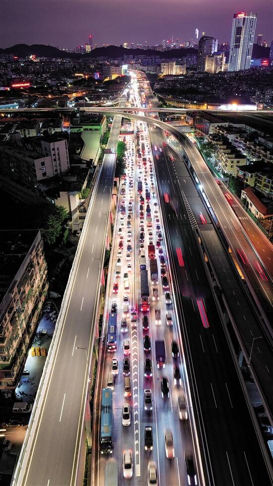 七日晚七时许,广州环城高速广园西立交桥路段,西行车流缓慢 羊城晚报记者 梁喻 摄