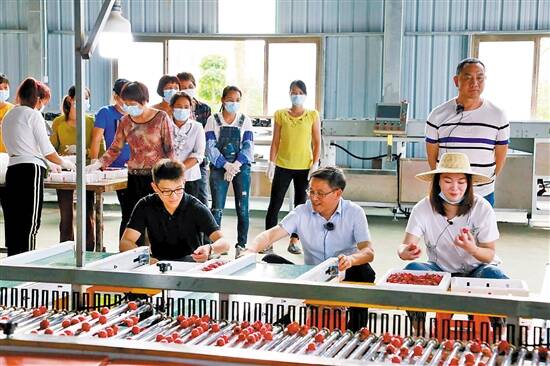 羊城晚报记者 许悦 “没想到一个农民培训课程我竟然看了两小时”“这课程还有吗?爱了爱了!”11日下午,“广东百万农民线上免费培训工程”第一课在湛江市遂溪县界炮镇圣女果基地上开课,老师们在直播间、在田间地头、在基地冷库现场授课,教栽培、教保鲜、教营销,因为课程内容丰富、老师授课风趣,原本面向广大农民的培训课程,成功破圈吸引了大批城里人、90后围观。仅腾讯微视直播间,开播后半小时,就涌入了106万人次围观。 [破圈] 农民培训太潮了 网友涌入直播间 “叮叮叮!”当日下午2时30分,随着一阵上课铃响,屏幕另一端的农民朋友代表走进了田间课堂就座,“广东百万农民线上免费培训工程”第一课在湛江市遂溪县界炮镇圣女果基地上开课,并同步在广东农产品“保供稳价安心”数字平台、腾讯微视直播间直播。 第一阶段的授课,在圣女果的田间地头旁搭了一个直播间,3位老师分别是栽培、保鲜、采购领域的专业担当,首先开讲“如何挑选圣女果”,由于科普知识讲得生动活泼,网友们乐了,大批在线提问涌入直播间。 圣女果是不是转基因的?广东省农业技术推广总站站长林绿解答:“这是一个认知的误区,很多人一看颜色比较特别、形状不一般的蔬果就认为是转基因的,其实转基因是在基因的层面,光看外表根本看不出来。圣女果并不是转基因作物,反而还是现在大番茄的老祖宗。圣女果就是最原始的番茄品种,营养丰富,常吃多吃对身体有着很大的好处。” 食品保鲜专家张晗因为颜值高,被网友不停地cue。有网友提问:买回圣女果如何保鲜?张晗回答:“最好的存储方式是吃掉,温度太高太低都不利于圣女果储存,会使圣女果失去鲜味。其次建议用保鲜膜包好,食用前再用清水清洗,以免破坏圣女果表皮的蜡质。” 第三位老师是盒马鲜生采购经理王墨涵,她爽朗的笑声响彻整个直播间,从采购的选品角度,她告诉农民朋友们什么样的蔬果最好卖,产供销一体化在线培训。 一个小时的室内课,在谈笑风生中一下子就过去了。紧接着,镜头跟随老师们走进圣女果的田间地头,转入专业授课,番茄专家林绿讲起专业课一点不带枯燥,“地膜大家应该都见过,它的作用是防止杂草生长、保肥保土,光照下反光发亮,还有驱虫的作用”“栽种圣女果的土地,不要和辣椒、茄子连种”…… [教学] 晚进冷库一小时 货架时间少三天 选择在遂溪圣女果基地上授课,还因为这里有广东、甚至是国内首创的“田头建冷库、销售促生产”模式。 张晗告诉大家:“水果保鲜取决于储存温度,一般来说,晚进冷库一小时,货架时间就会减少三天。”镜头随着老师们从田间地头走向附近的铭景农业,掐表一算,只要5分钟。 镜头所见,在界炮镇,往年随季节变换而不断改种的田地,现在几乎全部都种上了圣女果,形成了连片的圣女果种植基地。今年初的疫情,让鲜活农产品“运得出、供得上”的重要性一下子凸显出来。今年上半年,遂溪卖出了5000万斤圣女果。除了运营团队铭景农业多年累积的市场销售渠道,还因为这里的“田头市场”有冷链加持。 为促进生产与市场的高效链接,铭景农业斥资在田头建起6000立方米的冷库,能存储鲜果1000多吨,为果实生产、储存、运输、再加工及销售全过程提供保鲜所需的环境。圣女果从地头采摘之后,进行预冷处理,果肉保鲜温度一般不超7℃,因为温度太高果蒂容易脱离。 冷库的建成,提升了农产品产地商品化的处理能力,从源头加快解决了农产品出村进城的“最初一公里”问题。除了圣女果,铭景农业上半年还卖出了5000万斤火龙果、800万斤荔枝、300万斤火龙果,产品销售渠道遍布全国各地。 这也让遂溪成为广东“实施城乡冷链物流设施建设工程”的探索者。如今,当地农民“只管种、不愁卖”,鲜活农产品“运得出、供得上”,全产业链加持的田头市场正在广东遂溪逐渐成熟,在实践中逐步探索一条联农带农、富民兴村的特色产业发展道路,从源头加快解决了农产品出村进城的“最初一公里”问题。 [目标] 可在田间地头 随时随地学习 “懂了懂了”“老师讲得好实在”“90后前来学习”“超级实用”“没想到一个农民培训课程我竟然看了两小时”“这课程还有吗?爱了爱了!” 两个小时的在线课程转瞬即逝,因为课程内容实在太丰富、老师授课太风趣,原本面向广大农民的培训课程,成功破圈吸引了大批城里人、90后围观,仅腾讯微视直播间,开播后半小时就涌入了106万人次围观。 “广东百万农民线上免费培训工程”第一课一炮而红,广东省农业农村厅相关负责人表示:“这只是第一课,后面还有更精彩的内容,欢迎大家继续追看。” 羊城晚报全媒体记者了解到,这个培训工程,其实就是广东在今年丰收节上送给农民朋友们的一份大礼。 为什么会想到送上这么一份礼物?省农业农村厅人事处处长刘楚雄表示:农业农村人才是做好党的农村工作、实施乡村振兴战略的根本。为培养造就一批新时代精勤农民,省农业农村厅启动实施“广东百万农民线上免费培训工程”,以广东农产品“保供稳价安心”数字平台为载体支撑,以“开放+合作”为原则,汇聚科研、教育、产业及互联网等领域的多层次资源,把握“农民得到提升、讲师实现价值、产业得到支撑、乡村实现发展”思路,努力实现“聚集千名优秀老师、万堂精品课程、百万农民培训”的工程建设目标。