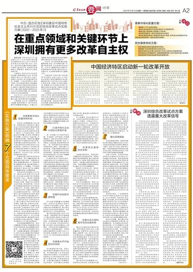 新华社电 中共中央办公厅、国务院办公厅11日对外发布《深圳建设中国特色社会主义先行示范区综合改革试点实施方案(2020-2025年)》,赋予深圳在重点领域和关键环节改革上更多自主权,支持深