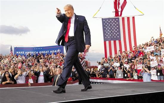 当地时间12日,美国佛罗里达州桑福德,特朗普在奥兰多桑福德国际机场举行竞选集会。白宫医生肖恩·康利当天表示,特朗普的新冠病毒检测结果已连续几日呈阴性,他不会感染其他人。 图/人民视觉