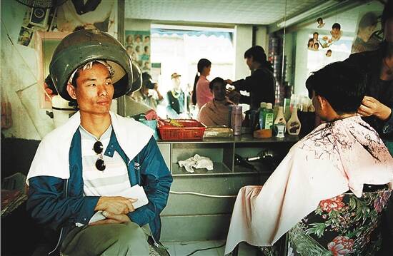1997年,珠海翠微村的男人“赶潮流”去发廊烫发 李伟坤 摄 |