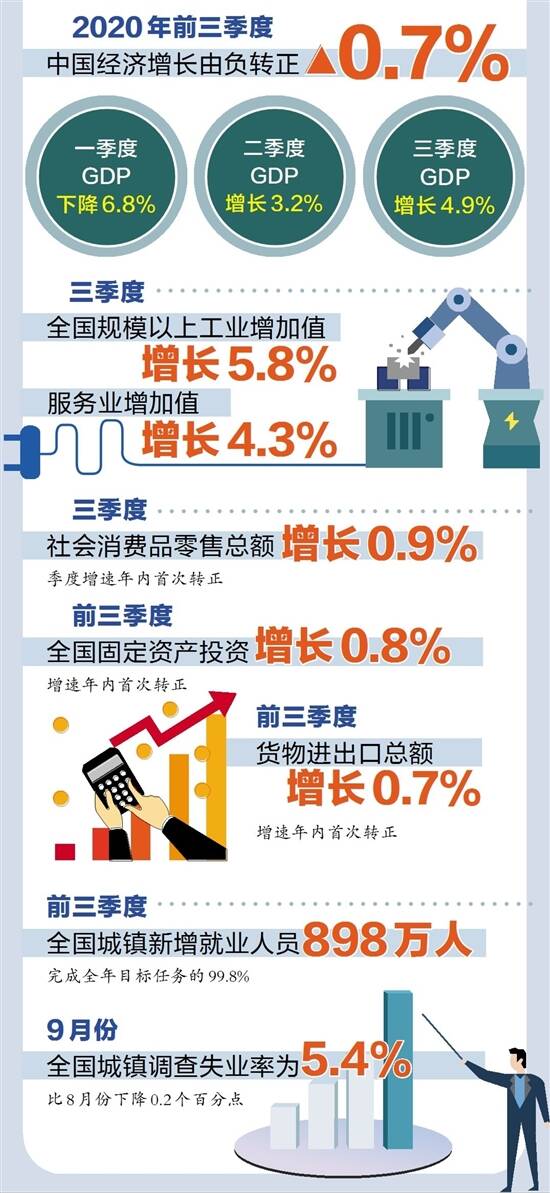 国家统计局10月19日公布三季度经济数据,多个指标由负转正表明中国经济正延续稳定恢复态势。记者采访专家学者,通过关键数据透视中国经济“三季报”。 GDP 整体呈现持续稳定恢复态势 初步核算,前三季度国内生产总值722786亿元,按可比价格计算,同比增长0.7%。分季度看,一季度同比下降6.8%,二季度增长3.2%,三季度增长4.9%。从环比看,三季度国内生产总值增长2.7%。 国家统计局新闻发言人、国民经济综合统计司司长刘爱华介绍,今年前三季度整体经济确实呈现出了持续稳定恢复的态势。需求逐步回暖,产业循环逐步畅通,市场主体信心在进一步恢复。 刘爱华表示,在充分看到好转趋势的同时,我们也要看到,当前境外的疫情形势仍然比较严峻,国际环境不稳定、不确定性仍然客观存在,国内有效需求仍然不足,地区、行业、企业的恢复还不均衡,经济持续向好的基础还需要进一步巩固。 就业 已完成全年99.8%目标任务 前三季度,全国城镇新增就业人员898万人,完成全年目标任务的99.8%。9月份,全国城镇调查失业率为5.4%,比8月份下降0.2个百分点,从年初6.2%的高位持续回落。 刘爱华表示,今年年初,面对空前加大的就业压力,各地区、各部门全面落实就业优先政策,前三季度城镇新增就业基本完成全年的目标任务,调查失业率呈现了稳中有降的态势。 中国社科院财经战略研究院副院长杨志勇认为,三季度就业形势总体好于预期,但就业形势仍然严峻。仍应高度重视重点人群就业,采取更有针对性的就业政策,更充分释放市场力量。 物价 CPI同比上涨3.3%涨势温和 前三季度,全国居民消费价格(CPI)同比上涨3.3%,涨幅比上半年回落0.5个百分点。猪肉价格上涨82.4%,比上半年回落21.9个百分点。9月份,CPI同比上涨1.7%,环比上涨0.2%。 中国国际经济交流中心首席研究员张燕生认为,从数据上看,物价整体趋于稳定,涨势比较温和。CPI回落主要是因为前期采取了扩大生猪产能和投放储备等保供稳价措施,猪肉价格涨幅回落明显,食品价格涨幅有所收窄。未来食品价格有望稳中趋降,整体物价会继续保持平稳。 消费 内需的贡献持续上升 前三季度,社会消费品零售总额273324亿元,同比下降7.2%,降幅比上半年收窄4.2个百分点。其中三季度增长0.9%,季度增速年内首次转正。线上消费快速增长,占比逐步提高。 刘爱华表示,消费需求处于回暖状态,市场销售明显改善。整体上来讲,内需的贡献在持续恢复,持续上升,对于构建双循环的新发展格局非常有利。下一步,要坚持扩大内需的战略基点,从增加居民收入、改善消费环境等方面继续发力,进一步推动消费需求的回升。 居民收入 城乡居民人均收入比值缩小 前三季度,全国居民人均可支配收入23781元,同比名义增长3.9%,扣除价格因素实际增长0.6%,年内首次转正。农村居民人均可支配收入12297元,名义增长5.8%,实际增长1.6%。城乡居民人均可支配收入比值为2.67,比上年同期缩小0.08。 中国人民大学公共管理学院教授许光建认为,居民收入实际增速由负转正,得益于我国经济的稳定恢复,表明中央和各级政府出台的各项保增长稳就业保民生的政策措施得力、落实到位。同时,城乡居民人均收入比值缩小,城乡居民收入差距有所缩小,说明了农业经济恢复较快,也反映了我国的扶贫工作卓有成效。 外资 实际使用外资首次实现“双转正” 商务部数据显示,今年1月至9月,全国实际使用外资7188.1亿元人民币,同比增长5.2%(折合1032.6亿美元,同比增长2.5%)。我国今年以来实际使用外资首次实现人民币、美元累计指标“双转正”。从季度情况看,三季度全国实际使用外资同比增长20.4%,增速明显高于一季度的-10.8%和二季度的8.4%。 张燕生说,中国产业链、供应链恢复较好,吸收外资形势进一步向好,带来一些新增的“蛋糕”。未来中国的经济形势或将好于国际预测,但同时也要看到,稳外资形势所面临的风险始终存在。 外贸 货物进出口由降转升 前三季度,货物进出口总额231151亿元,同比增长0.7%,增速年内首次转正。出口127103亿元,增长1.8%;进口104048亿元,下降0.6%;贸易顺差23054亿元。9月份,进出口总额30663亿元,同比增长10.0%。贸易结构继续优化。前三季度,一般贸易进出口占进出口总额比重为60.2%,比上年同期提高0.8个百分点。 中国贸促会研究院国际投资研究部主任刘英奎认为,前三季度外贸不仅实现了正增长,结构也在不断优化,市场结构不断多元化。这得益于稳外贸政策效果的显现、市场多元化战略的实施以及企业自身的转型。中国外贸正增长对于促进全球经济恢复和贸易发展都发挥了积极作用。 房地产 楼市活跃度明显提升 1至9月份,全国房地产开发投资103484亿元,同比增长5.6%;商品房销售面积117073万平方米,同比下降1.8%;商品房销售额115647亿元,增长3.7%,增速提高2.1个百分点。 中原地产首席分析师张大伟分析,整体看,房地产市场已基本走出疫情影响,房地产投资开始复苏。虽然销售面积同比略有下调,但从目前市场趋势看,楼市的活跃度明显提升,市场有望继续恢复。(新华社)